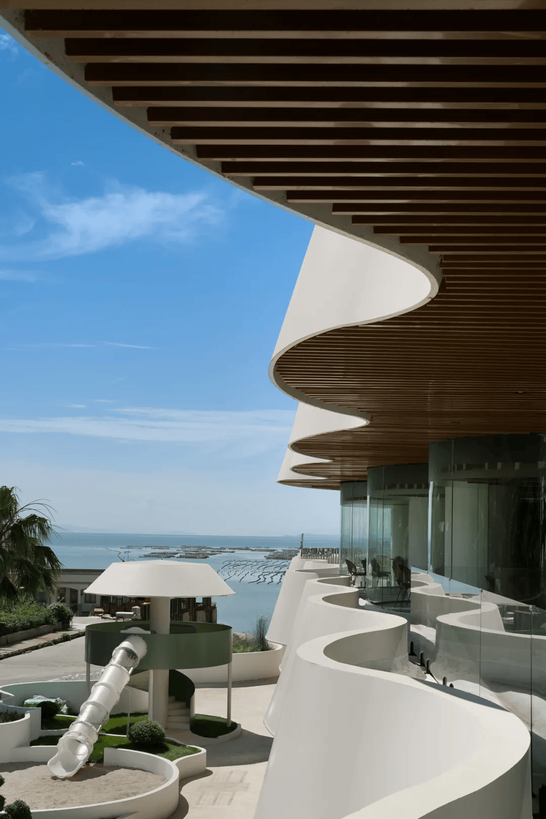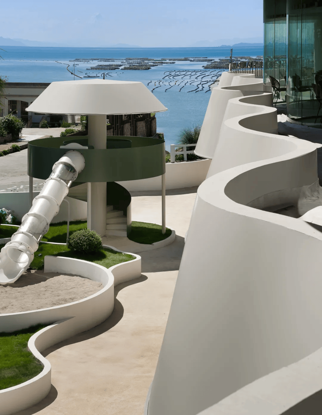 薄荷日落餐厅位于温州南麂岛,由原有建筑整体重构而成,面向大沙岙海岸与日落观景轴线。设计以海岛自然为母题,通过连续起伏的白色曲面回应海浪与风的动态,并采用钢结构与玻璃体系结合氟碳涂层与贝壳粉处理,应对海岛气候侵蚀。建筑通过内退形成大 尺度观景露台,强化日落体验,同时以环形玻璃界面模糊内外边界。三层空间结合餐饮、休闲与亲子功能,组织多层次使用场景,在在地文化与度假体验之间建立连续联系,提升整体文旅吸引力。