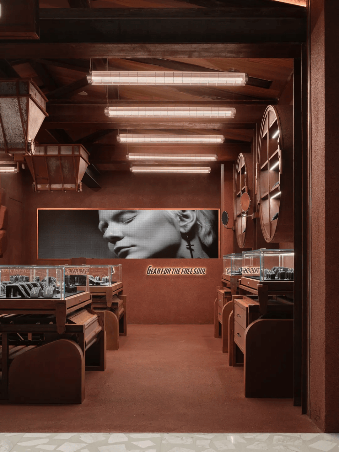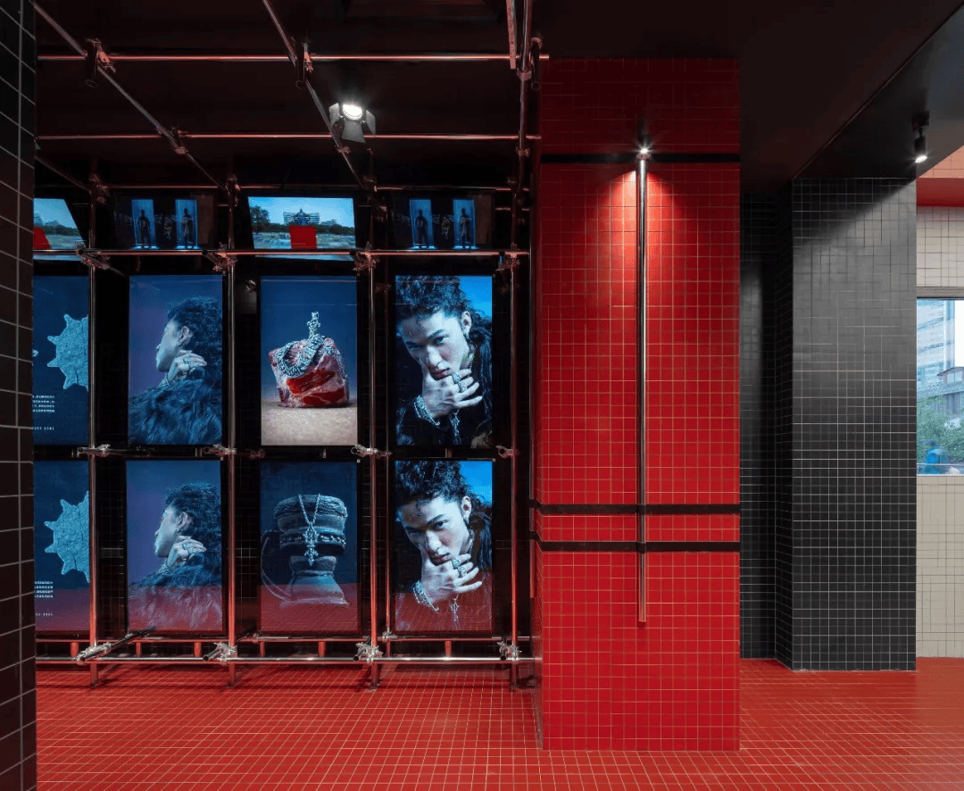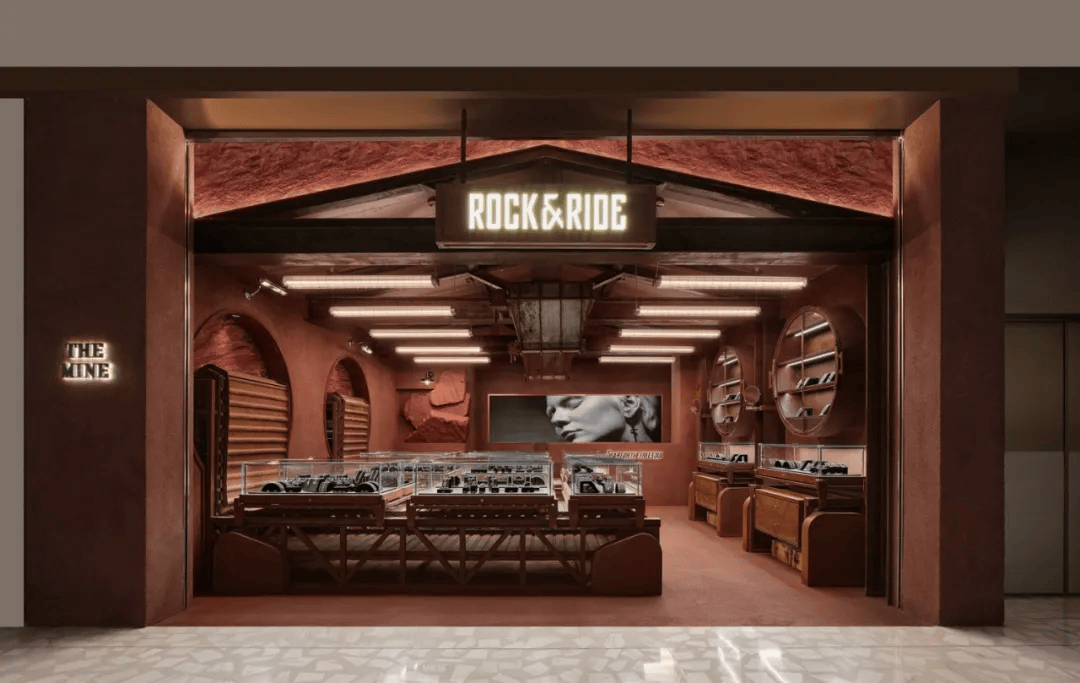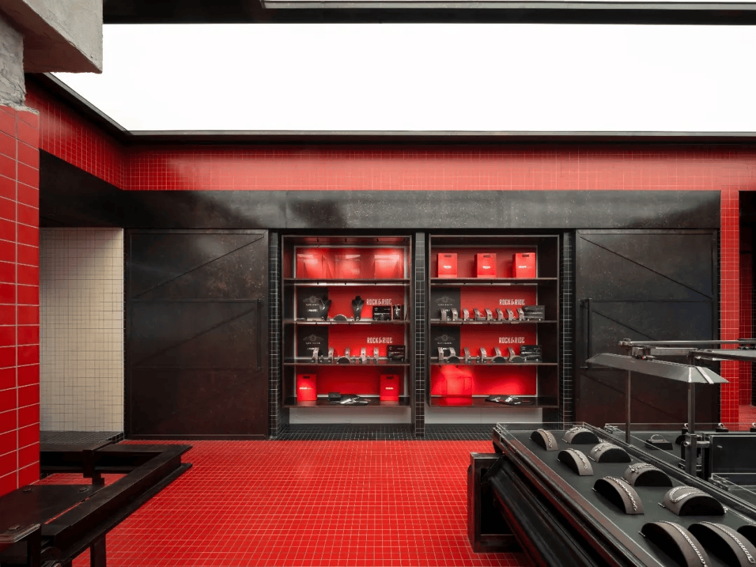 “矿地骑士”概念店以首饰生产过程为叙事原型,将“开采—加工—传送”转译为空间体验。设计通过重工业构件的直接介入,构建出具有冲击力的展示环境:磷板传送机被改造为展台,并与可滑动玻璃展柜形成动态展示系统;吊顶转化为矿场坡屋顶,耐候钢结构强化工业语境。空间以红色水洗石为主基调,结合筛石装置、下料口等元素,营造未完成与成品之间的对话,使店铺从单一零售空间转化为具有叙事性的沉浸式场景。