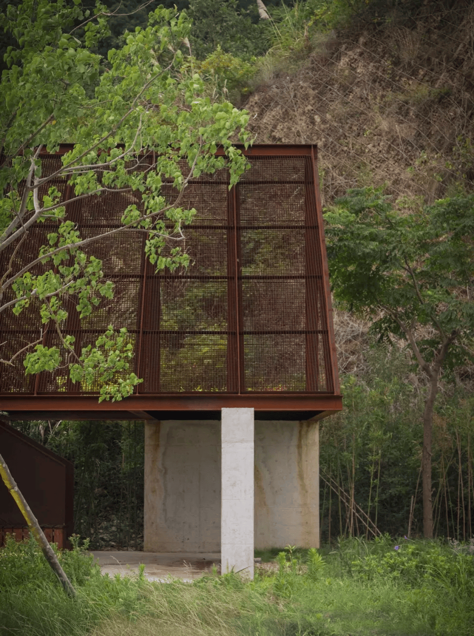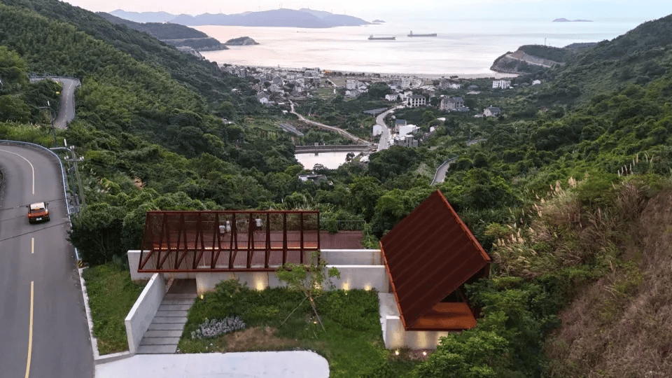 该项目位于浙江宁波象山县临海山谷,在原有观景亭基础上进行改造与扩建。设计将双坡屋顶拆解为两座单坡顶亭体,通过垂直交错的关系与混凝土墙体组织流线,并围合出面向海景的半开放庭院。两座亭延续统一的钢结构与耐候钢格栅体系,一高一低、一紧凑一舒展,在光影变化中呈现不同空间表情。通过尺度对比与路径组织,建筑将登高、转折与停驻串联,使观海体验转化为连续的空间叙事。