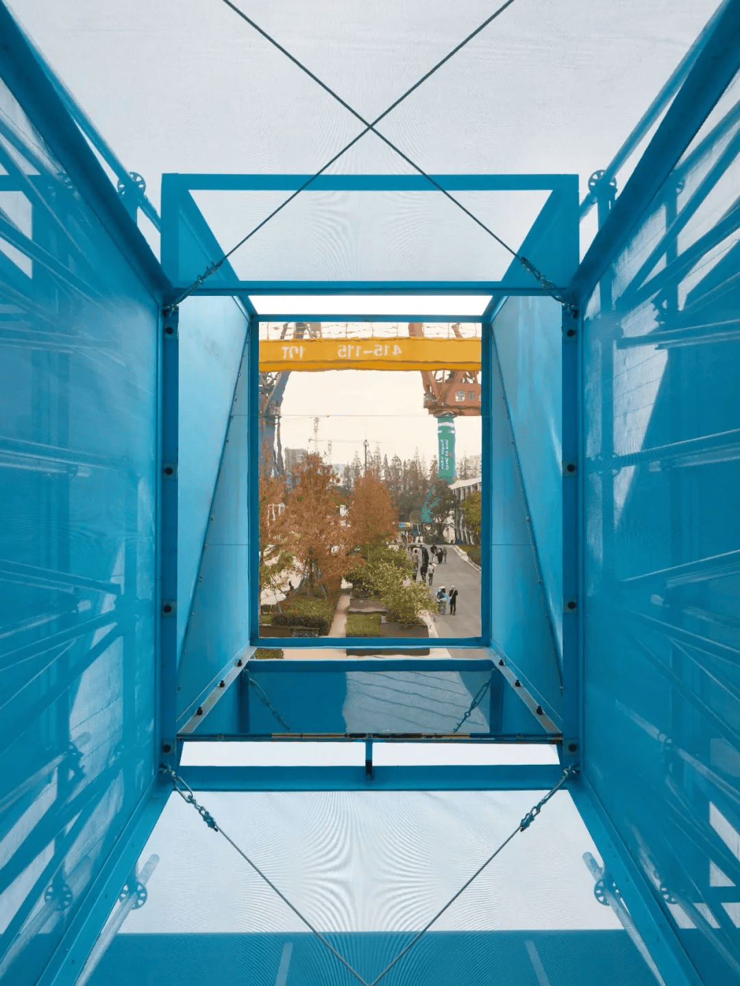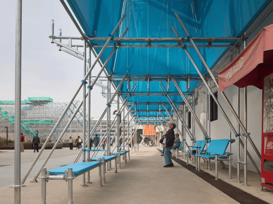 装置《下水那天》位于上海复兴岛船台公园原中华造船厂旧址,以船舶“下水”这一工业记忆为线索展开。设计通过斜置镜面不锈钢构建“潜望镜”,引导视线越过船台指向江面与闸门,重建场地的纪念性。装置采用盘扣脚手架模组化体系,以轻量结构回应造船“组装—整体”的逻辑,并通过局部转向与未完成状态,串联历史吊机与当代船厂。表面覆盖半透明网格布,在遮蔽与开放之间形成可停留的公共空间,使工业遗存转化为兼具记忆与日常的城市介入。