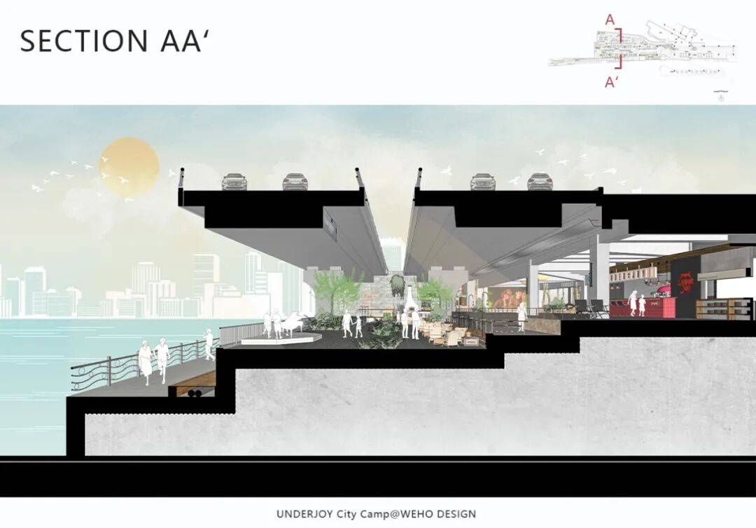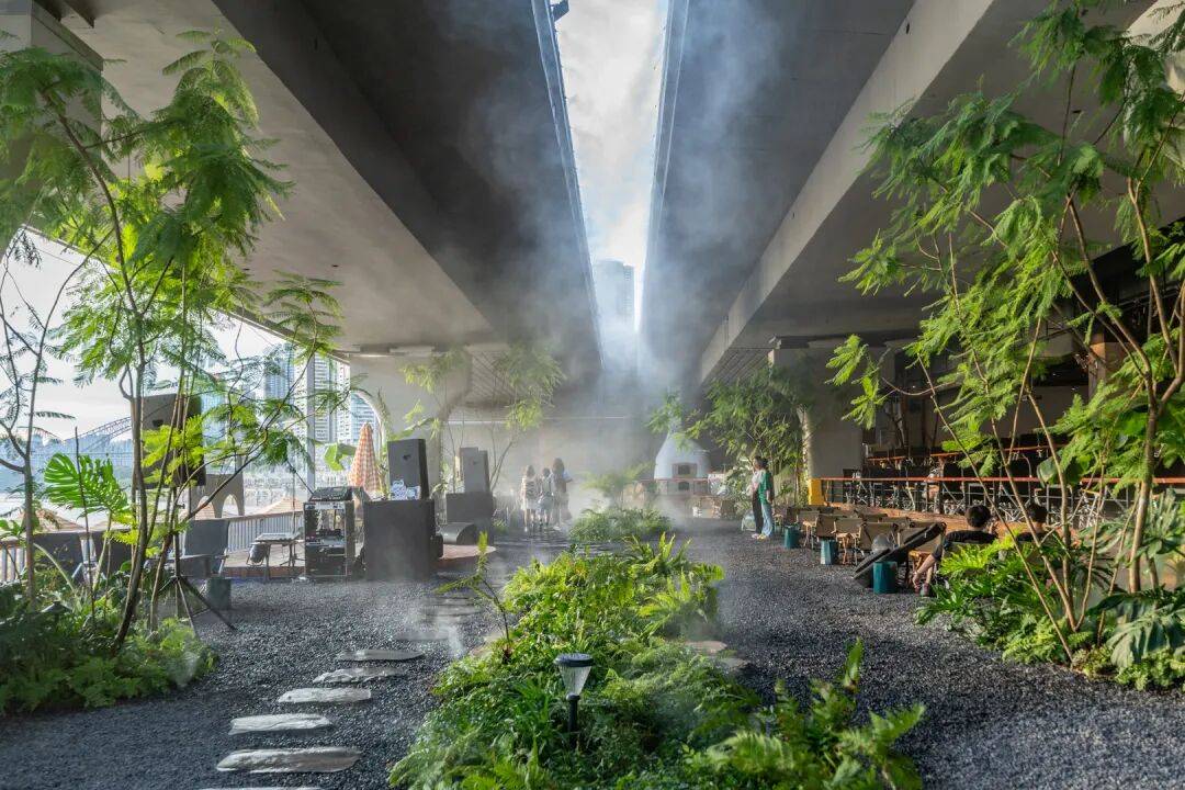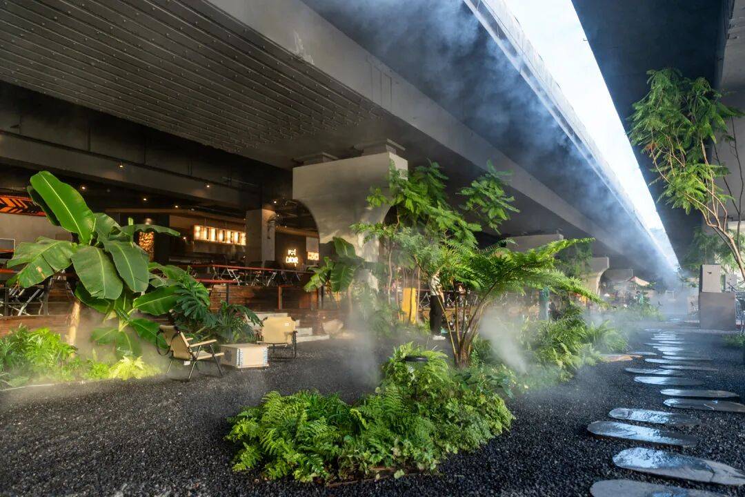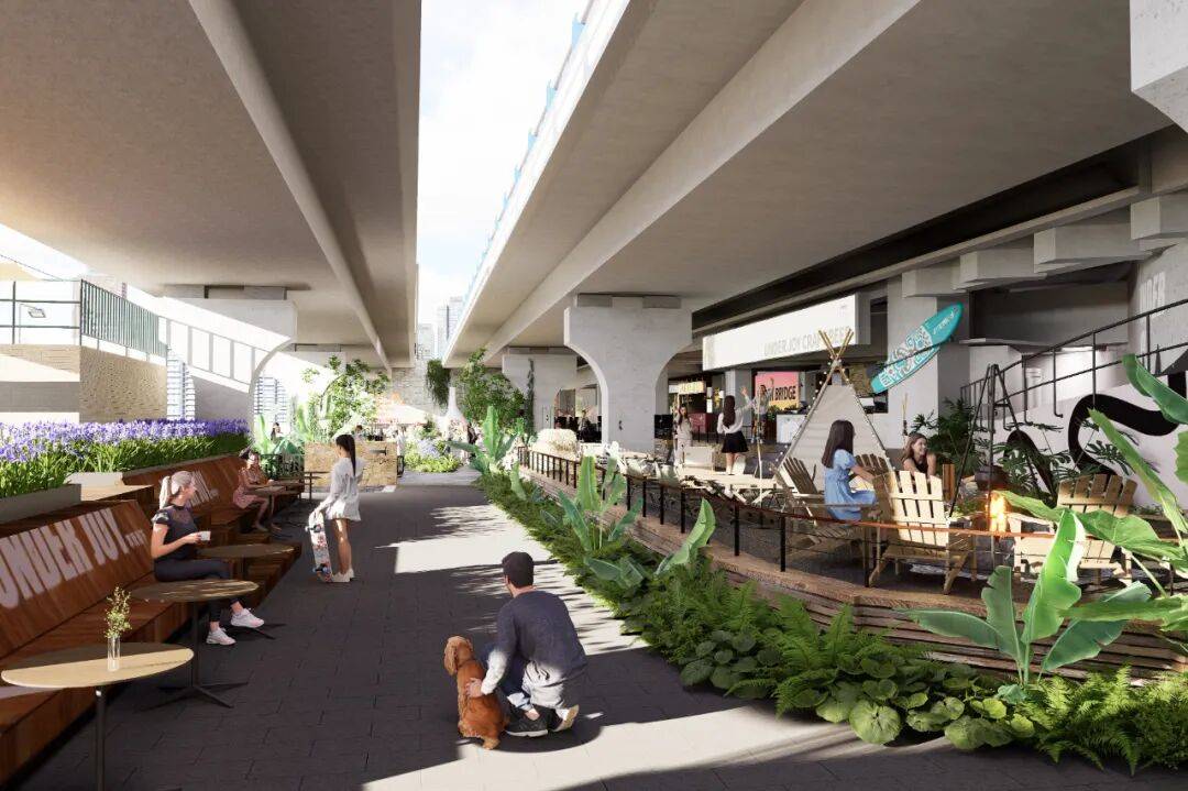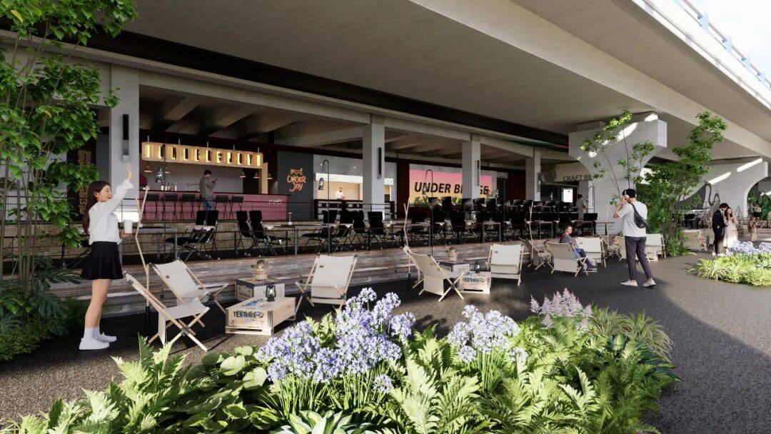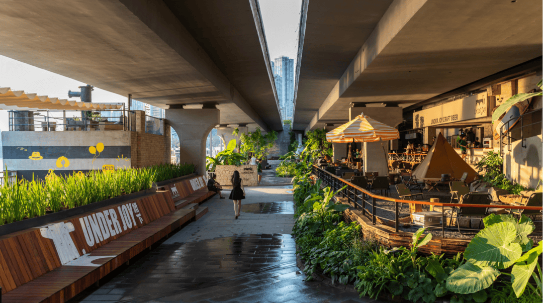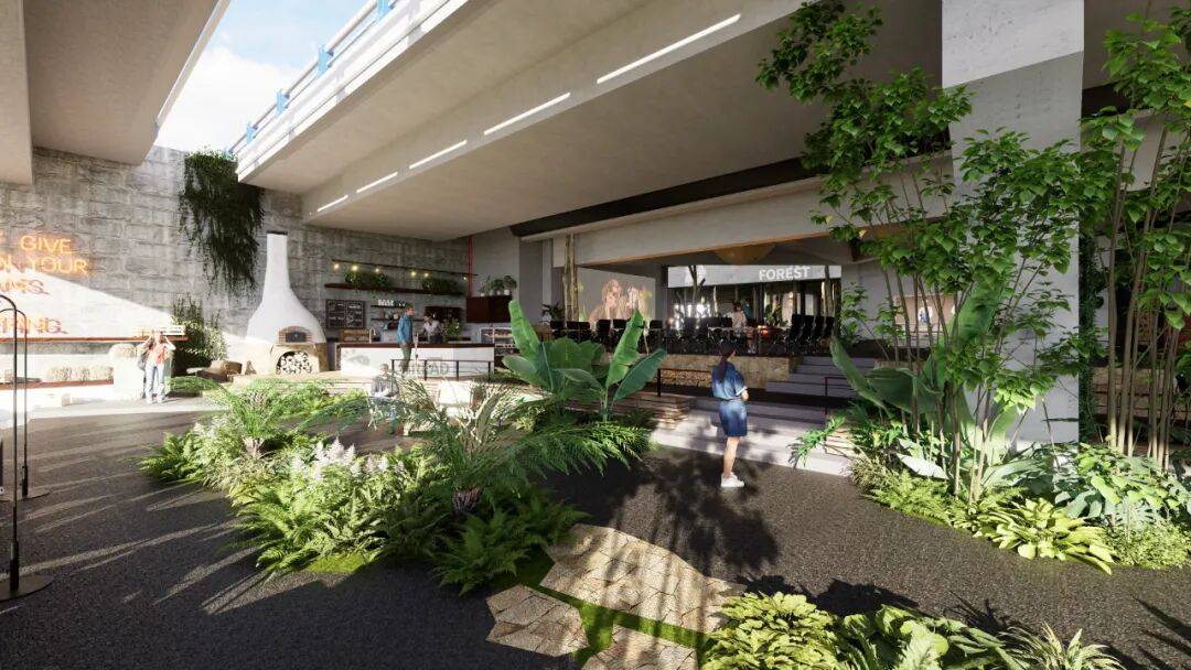 ▲剖面图©物候设计 策略二:借意自然——在“桥下花园”中融合多元体验 我们以"自然"为设计主线,将这片桥下空间打造为一个充满生命力的花园聚落。通过错落的绿植、木质平台与沉浸式灯光,让原本单调的水泥桥墩焕发新生,与多元业态形成巧妙呼应。
