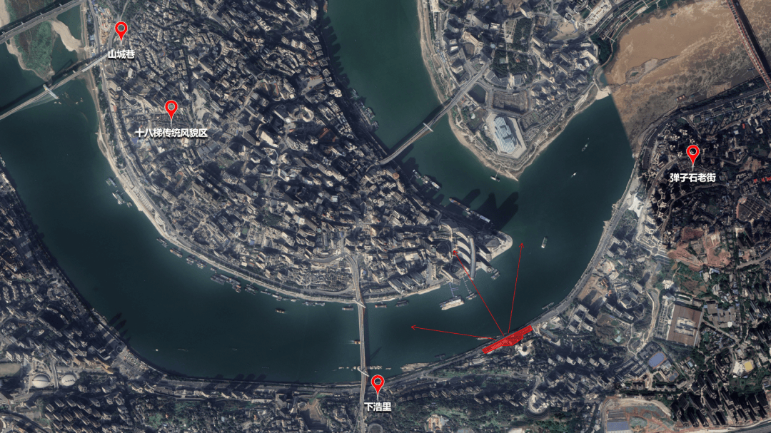 核心地标环绕:身处南滨路商业主轴,与龙门浩、下浩里、弹子石老街等热门目的地紧密相连。 绝佳观景平台:项目正对渝中半岛,来福士广场、两江交汇处尽收眼底,是观赏城市夜景、江景与无人机表演的绝佳位置。 必经游览动线:位于经典 Citywalk 路线的核心节点,天然承接大量探索人流。 然而,即便坐拥如此优越的条件,周边区域依然面临着业态趋同、过度旅游化的挑战。 这恰恰引出了项目的核心命题: 在这样一个流量与美景兼备的绝佳位置,如何唤醒这个被荒废的桥下空间? 它如何才能超越“游客打卡地”的局限,成为一个能持续吸引市民、并真正融入城市生活的空间?