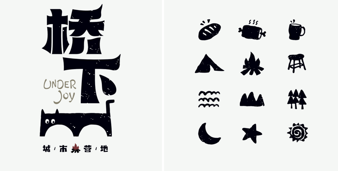 各业态通过绿植、创意软装、灯光与木质等自然材料的运用相互连接,以创意景观场景打造沉浸空间,有效规避层高不足的限制,共同构建出多元融合的餐饮业态体系。 三、VI 视觉系统设计 ①案名与品牌口号 • UNDERJOY桥下:中英文组合朗朗上口,直指项目区位与欢乐体验的核心定位 • 灯火重庆、乐在桥下:融合城市文化基因与空间特色,塑造全新城市休闲名片 ②品牌标志设计 共创过程中大家一眼爱上的这款标志,将自在松弛的猫咪与重庆桥墩巧妙融合。借猫咪的亲和力传递项目倡导的松弛感,同时巧妙融入桥墩的稳固形态传递桥下空间的独特性。造型简约现代,令人过目难忘,生动展现项目融合自然放松与城市特质的独特气质。