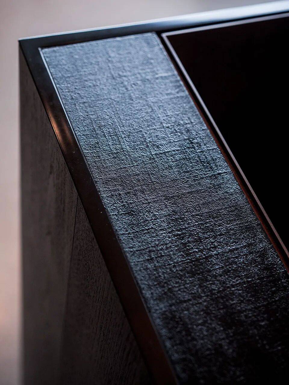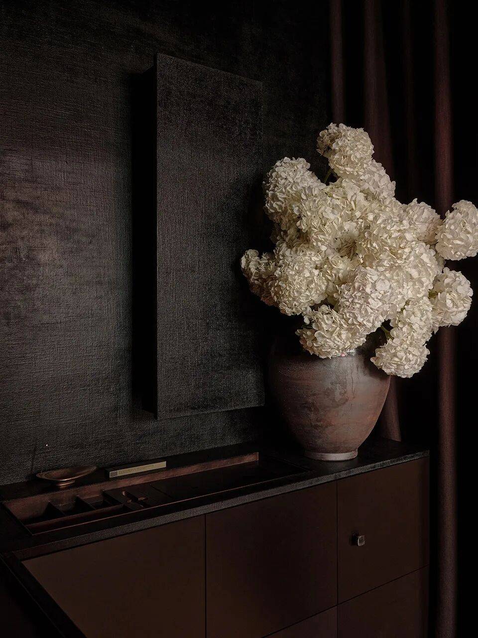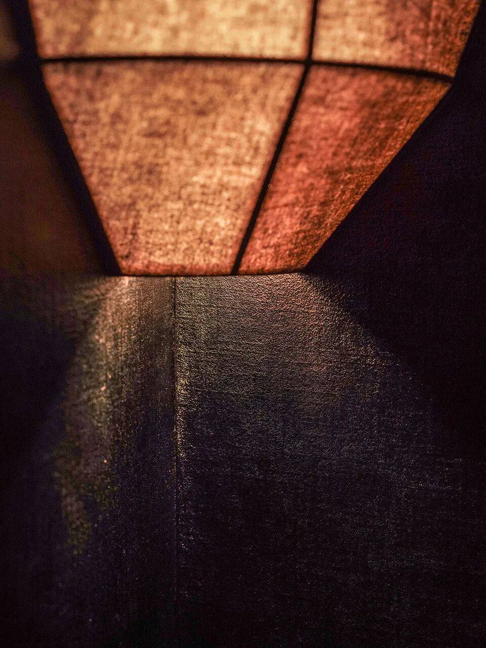 ▲室内一角© 雷坛坛,由伊索提供 我们邀请了杭州大漆艺术家张钧雷老师,将大漆髹饰于布胎。在水槽台面、层板与器物表面,坚实漆壳下隐现的纺织肌理提供了更为亲切的触感。香水盒作为空间中分量最重的物件,开启瞬间便露出华美的金色——随视角切换,金色呈现出深浅不一的明度与笔触。大漆的色泽将随岁月流转缓慢蜕变,为空间赋予了另一个维度的厚度与重量。