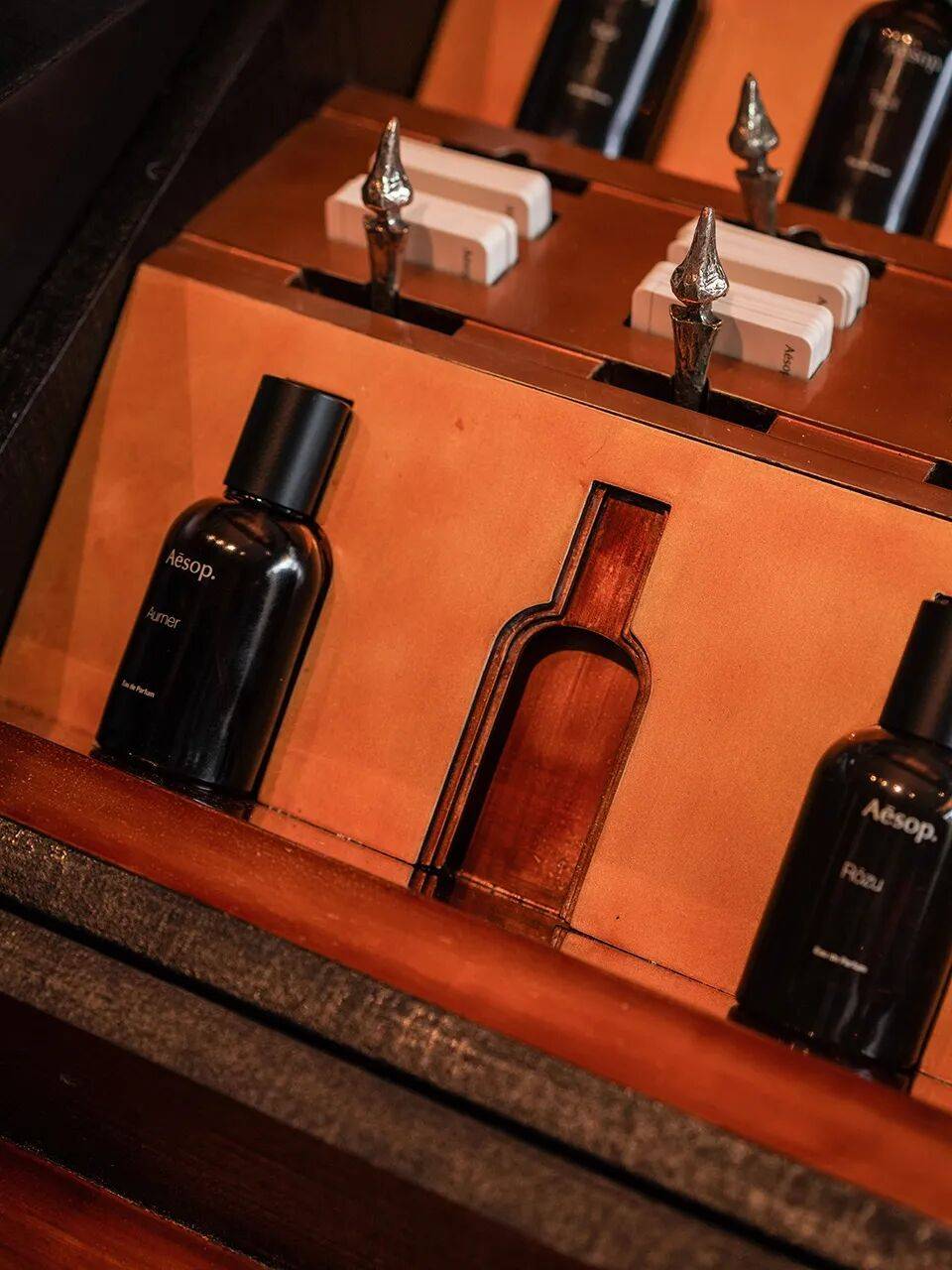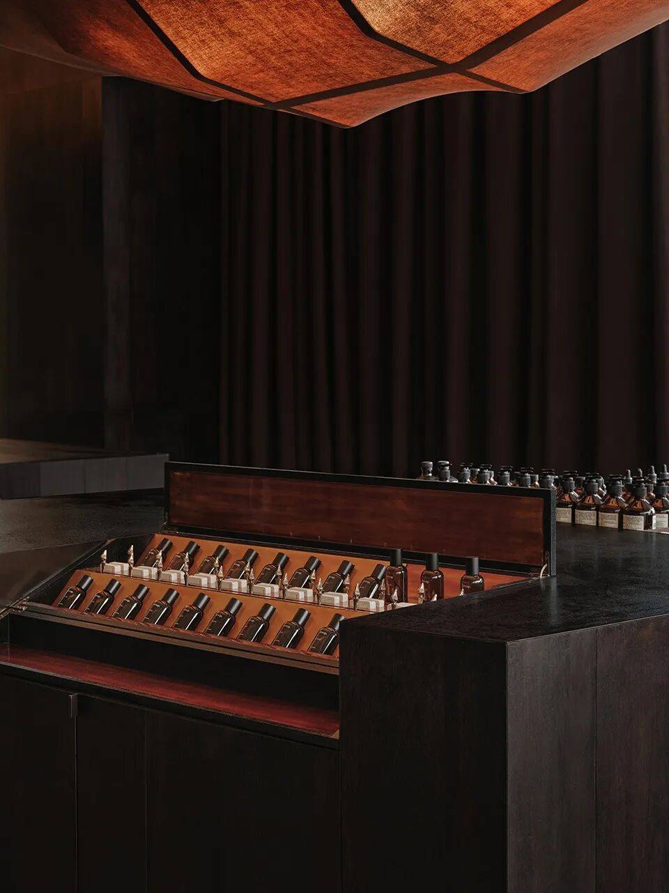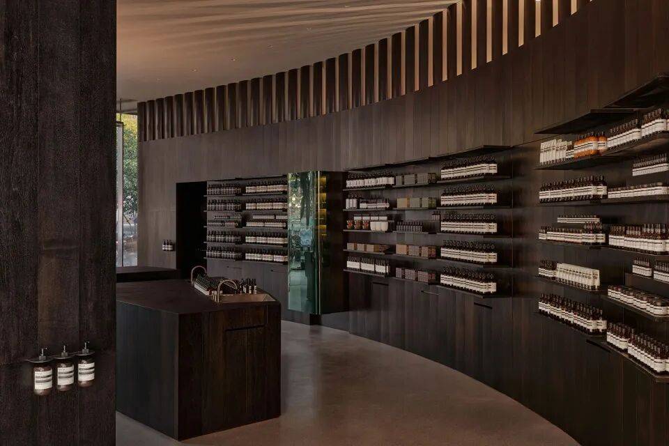 ▲陈列细部© 张钧雷工作室 古建偏爱大漆,其深沉浓郁的质地在微光下呈现出含蓄内敛的东方气韵。弧墙借由木材的天然纹理与大漆的温润反射,将室外的自然光与绿意“借”入室内。为保持视觉的连贯性,货架隔板与墙面特意脱开2cm;香水柜门则选用湖泊绿彩釉玻璃,如滤镜般加深了绿影的重叠。