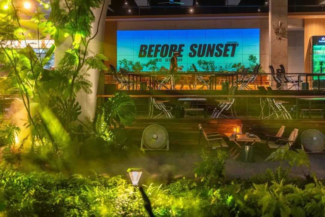 上层多元餐饮区 多种业态在自然语境的串联下有机展开,形成完整的消费动线:餐厅流线经优化确保出餐效率,明厨设计增强用餐体验感。 座位布局分区设置:团建区满足多人聚餐需求,绿植围合的卡座区保证私密性,散座区适应快速消费节奏。 多场景融合:精酿啤酒与 DC 风格篝火区营造松弛氛围;夕阳打卡卡座成为拍照热点;美式窑烤展现开放式烹饪魅力;密林团建区打造独特聚会体验。