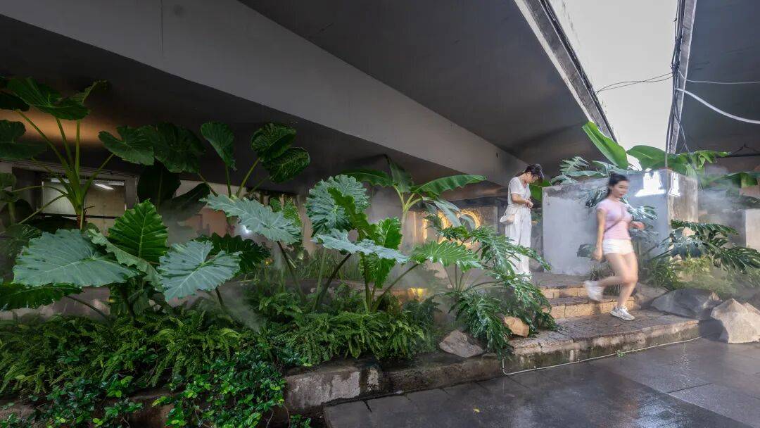 下层花园与面包房 行至两桥缝隙处,别有洞天。一道"一线天"光从桥隙洒落,与缥缈的雾森系统交织出梦幻光影。设计灵感源自雨水从缝隙洒落、滋养自然生机的意象,将原本泥沙淤积的荒废空间化作一处野趣盎然、充满意外之喜的生态花园。面包窑飘散的麦香与植物的清新在空气中交融,粗粝混凝土桥体与灵动生机的碰撞,让这里成为都市中意外的心灵栖息地。