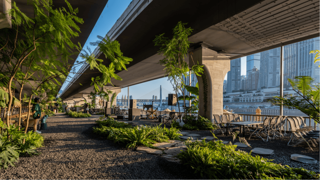 ▲桥下空间旧景 02. 破题 在"既要又要”中,创造松弛的统一 面对复杂场地与多元客群,项目挑战清晰而具体: 如何在一个近 4000 平米的桥下空间里, 既要吸引追求新鲜体验的游客,又要融入本地人真实的日常生活烟火气; 既要有啤酒烤肉的酣畅淋漓,又要有面包咖啡的日常温暖。 这看似矛盾的“既要又要”,恰恰是项目设计的起点。我们的答案,不是简单地分区划片,而是通过两大核心策略,将它们融合为一个富有张力的整体: 策略一:借景重庆,换个角度看山城 我们通过精心设计的观景平台与阶梯式外摆区,将渝中半岛天际线、来福士建筑群及江景精准框取。这些经过严谨视线分析后设置的专属区域,为游客提供了欣赏夜景与无人机表演的最佳视角。在专设的观景平台上小坐,举杯时对岸的璀璨灯火尽收眼底,让城市夜景成为用餐时最动人的背景。