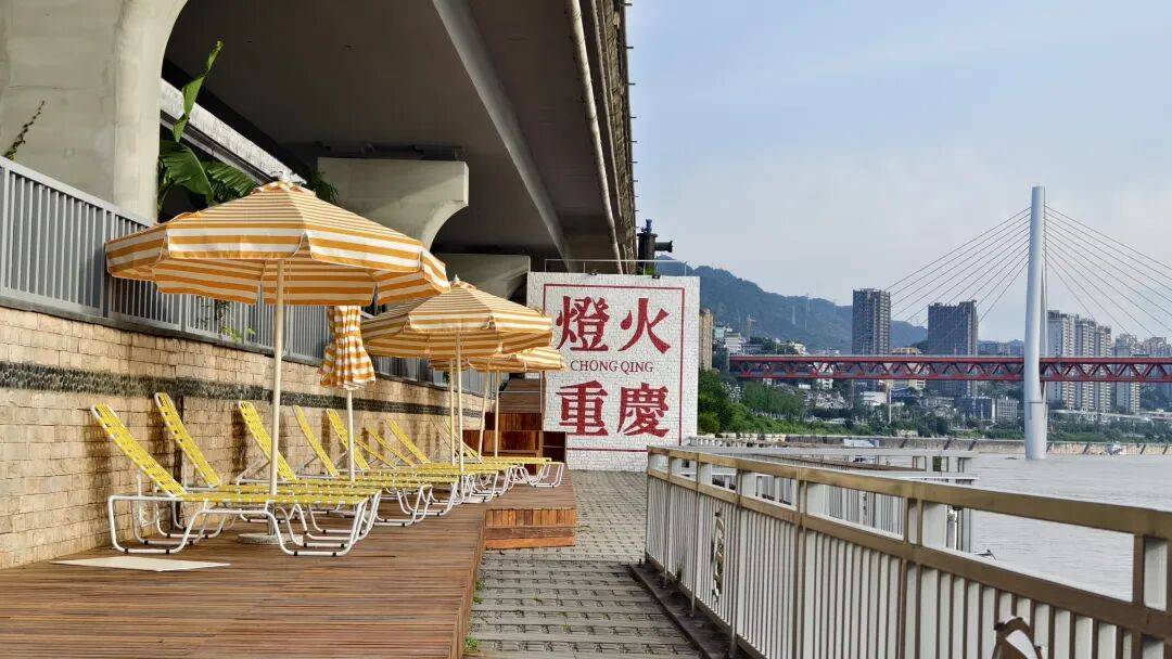 江景平台 将废弃的水泵房区域改造为可"躺平"的阶梯式观景平台。通过架高的木制平台设计,形成可坐可卧的休闲空间,既保护了原有设施结构,又创造出舒适自在的观景体验。平台面向渝中半岛展开,让游客在躺卧间即可将"灯火重庆"的璀璨夜景尽收眼底,成为项目中最具人气的放松聚点。