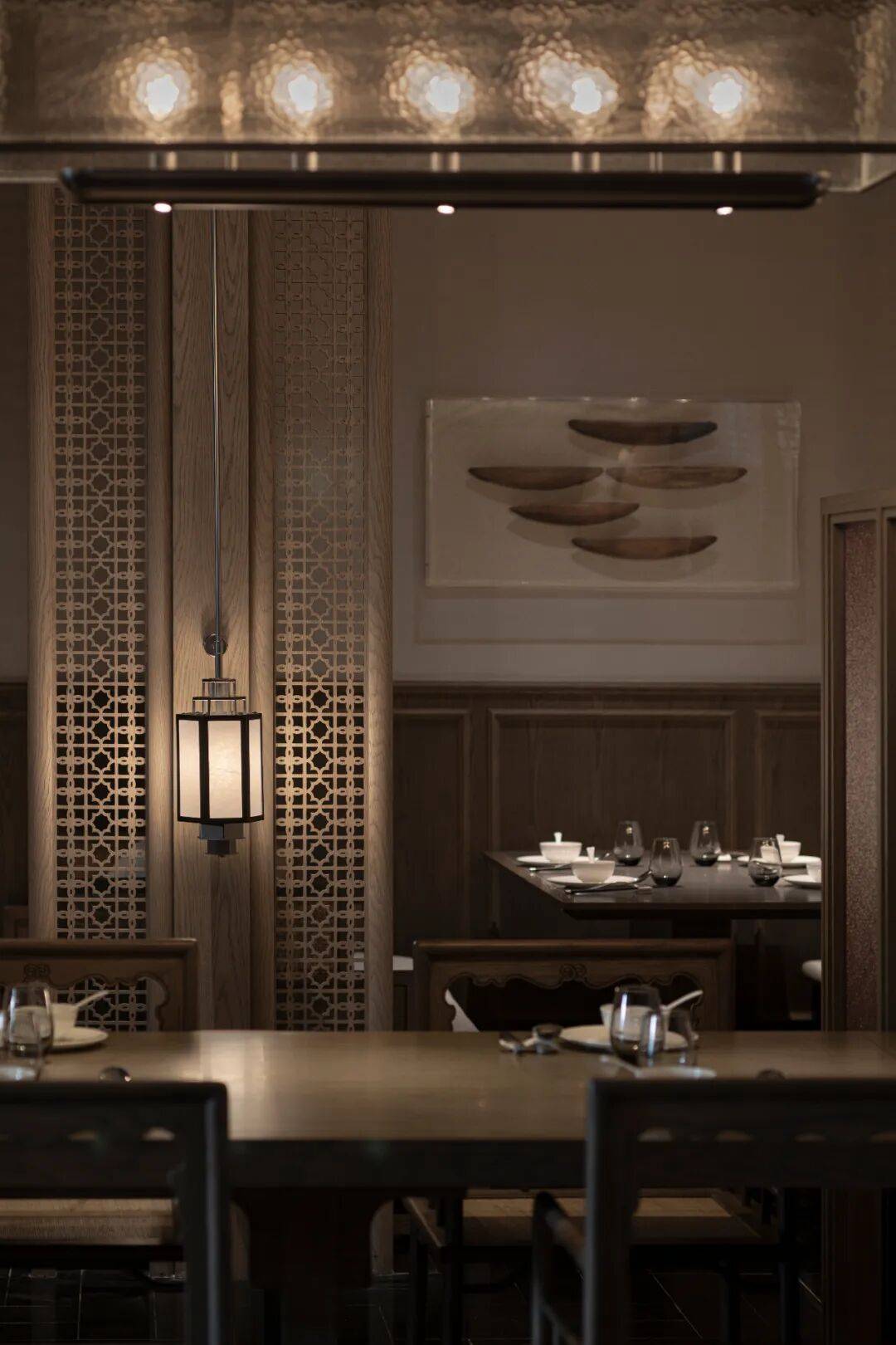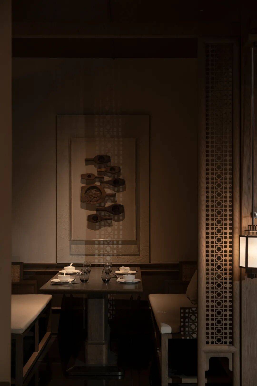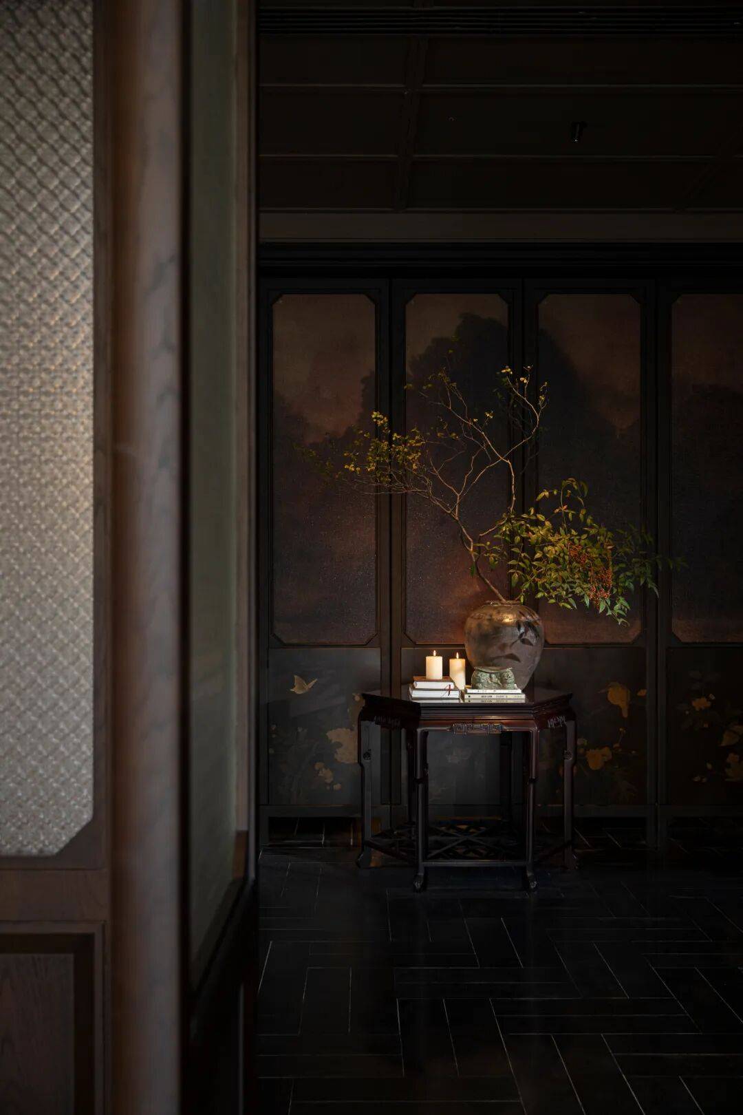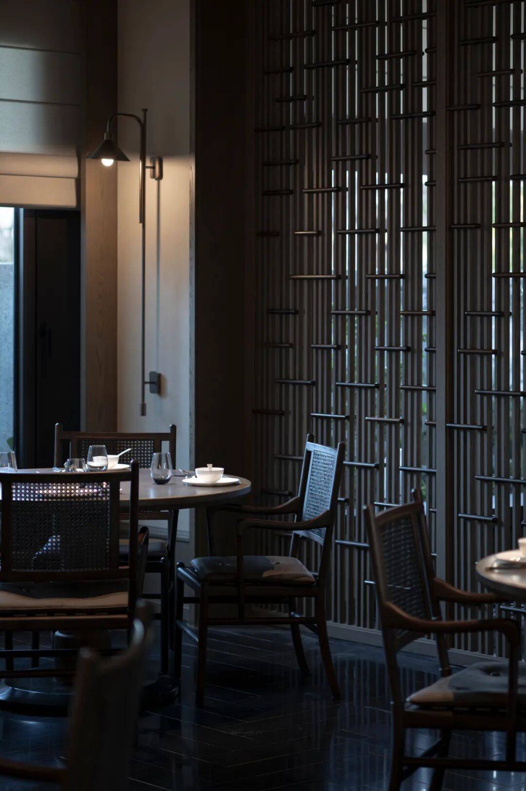重屏透韵:时空叠映,东方意蕴的当代表达 屏风,这一承载千年文人精神的母题,在此被赋予了现代语境。它不仅是灵活划分空间的实用元素,更是意境营造的关键。借鉴文徵明画中“素屏”的极简风骨,我们运用了材质多元的现代屏风:大堂散座区的巨幅屏风以现代水墨渲染的山水为面,意境空灵悠远。其底座匠心独运,绘“莲叶何田田”的荷花图样,暗合江南水乡的柔美与高洁。屏侧常伴以疏密有致的木质格栅,挺拔如修竹,既为区隔,亦成景致,隐喻文人风骨。四季厅的空间过渡处,半透半隐、虚实相间的纱质屏风被广泛应用。它们制造出朦胧的透视感,人影绰绰,灯火微明,营造“犹抱琵琶半遮面”的含蓄之美,空间因此流动起来,层次愈发丰富。
