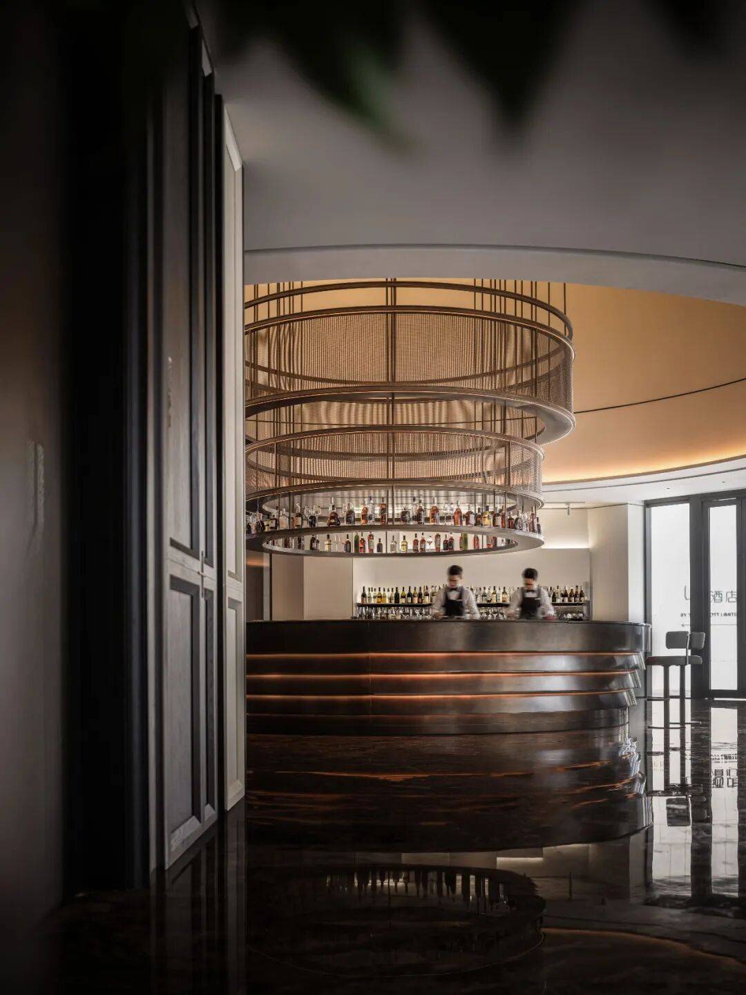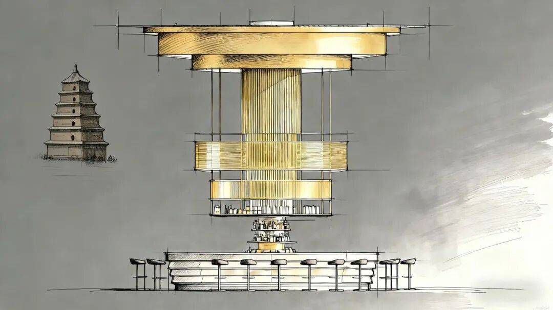 视线再次被震撼,进入“览市”高潮,它如一座微缩的“空中市集”,仰望如丝路盛景盘旋升腾,俯瞰呼应悬浮倒立的塔,形制已非“凡间之物”,化用杜甫“此曲只应天上有,人间能得几回闻”的意境,将其定义为“云外之市”。在此环形水吧台内举杯,饮的是盛唐之境下的琼浆,交易的是如天上仙乐般稀缺的盛唐精神生活方式。