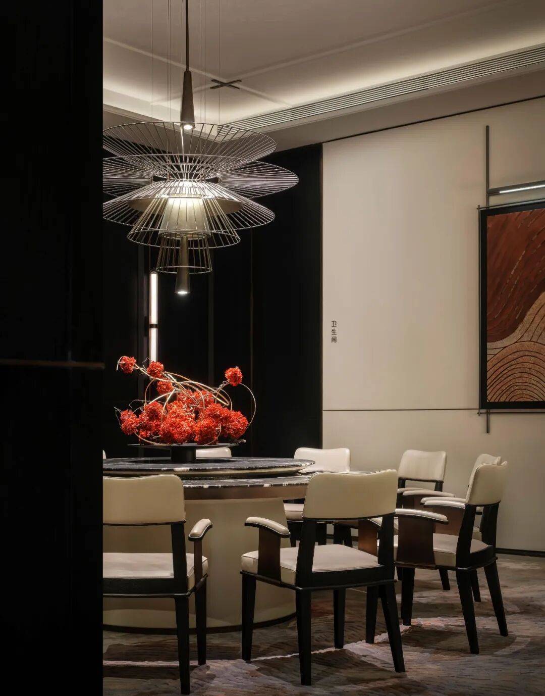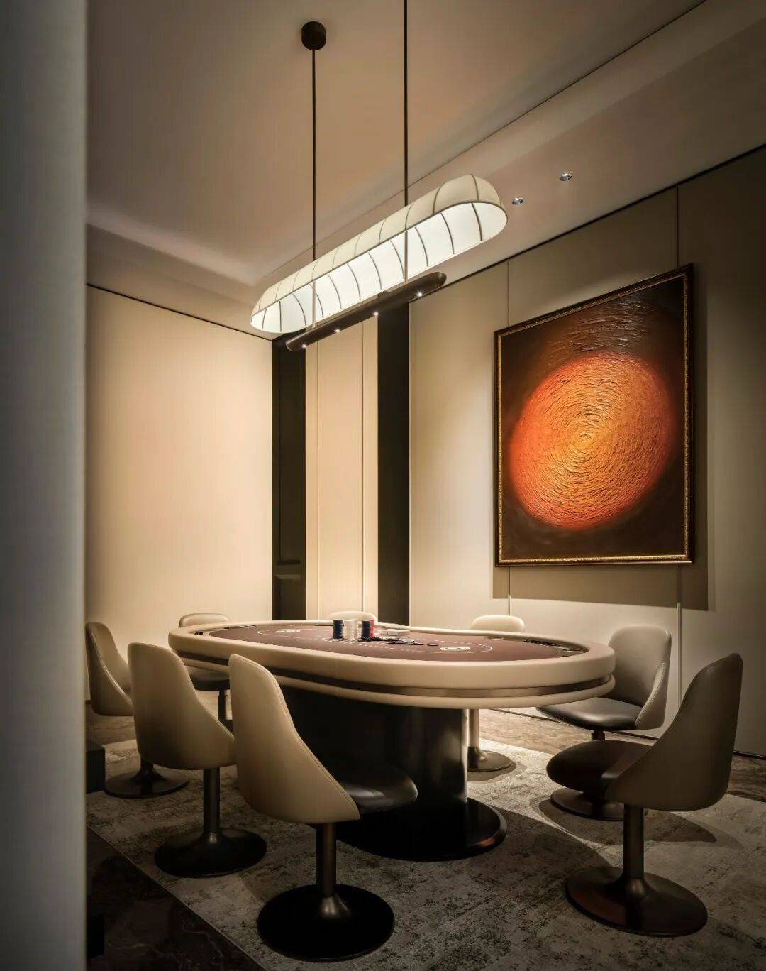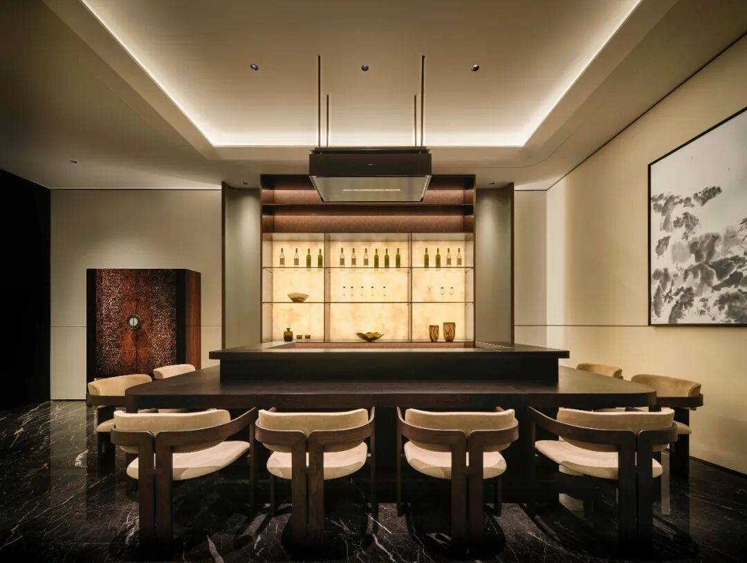 欢宴落市--一诺千金购市契 从开放的浅洽区向内延伸,转入此境,喧哗如潮水般退去。四个独立的VIP室,大量黑色木饰面如铁画银钩,铺陈出深邃稳重的基座,点缀米白色调则以水墨笔意轻盈勾勒,仿若宣纸上最后一道提亮的锋毫,威严中透出难以言喻的亲和,宛如静置于时光深处的玉函,分别蕴藏着深度对谈的机锋、茶禅一味的清寂,以及名流云集的雅集。 琼宴落市,中餐圆桌的圆满礼序,铁板烧台前的炙热演绎,以及德州扑克的松弛氛围,共同构筑了商务与私享最顶级的宴乐舞台。它们独立成章,却又在更宏大的叙事中气韵相通,构成一个为巅峰社交量身定制的精密生态,每一处滋养的场域都默默标注着被精心对待的细节