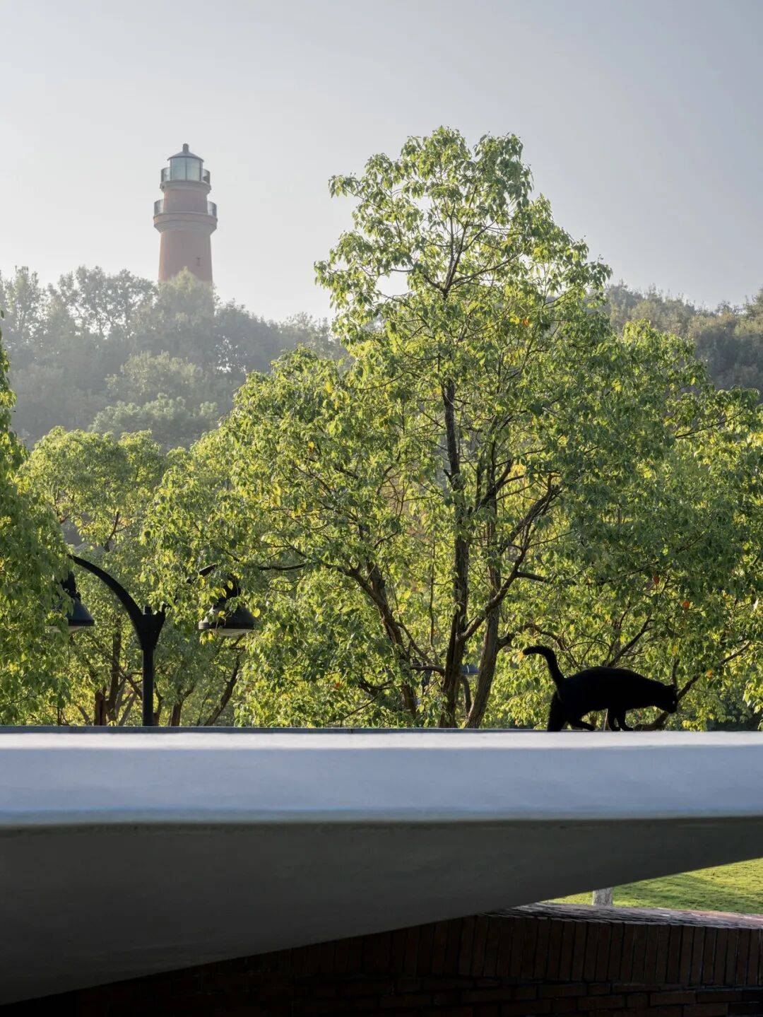 水盘与启真塔 ©Chen Xi Studio 这一想法得到了学院的信任与支持。于是命题从“一座雕塑”被解放为“一处场所”——“亭”的概念自然浮现。它意味着庇护、停留与聚集,既能容纳象征性的精神核心,也能围绕它展开日常的休憩、交流与沉思。 选址的变迁:从观景台到日常交汇点 亭的落位经历了三次改变: 最初选址于校园山顶,毗邻校区标志性建筑启真塔,取“登高望远”之意,名为“飞鸟亭”——以舒展形态回应场所,感受海风、仰望蓝天。之后,为规避对启真塔影响的风险,场地移至山脚一片四面环林的绿地中央。方案调整为以圆形水盘为核心视觉元素,配以一道如同刻入绿地的清水墙,“水亭”概念在此初步成形。