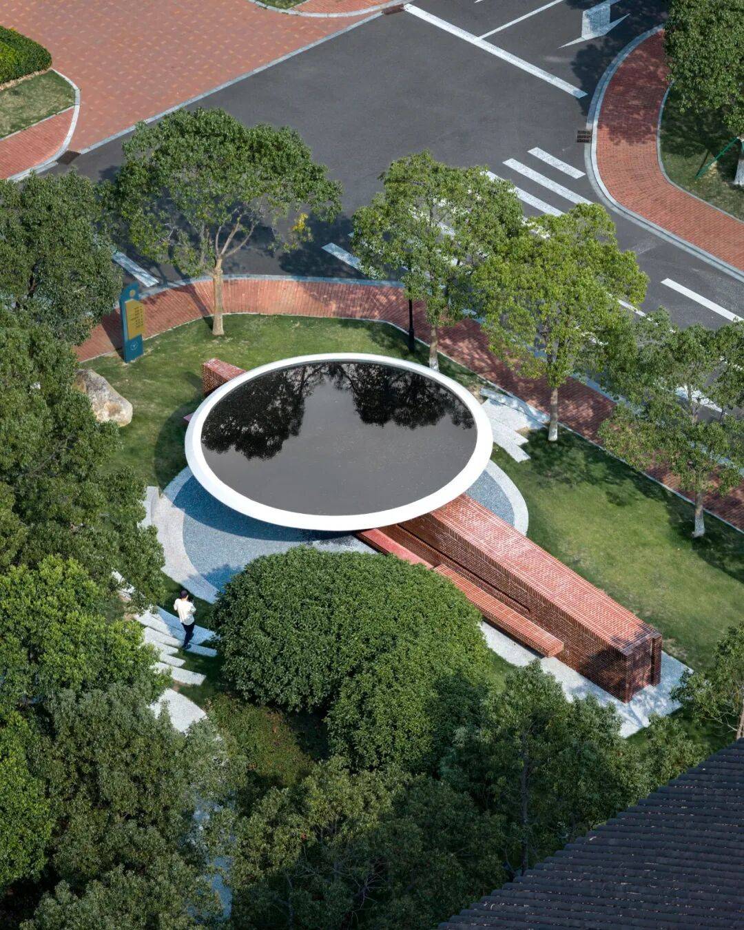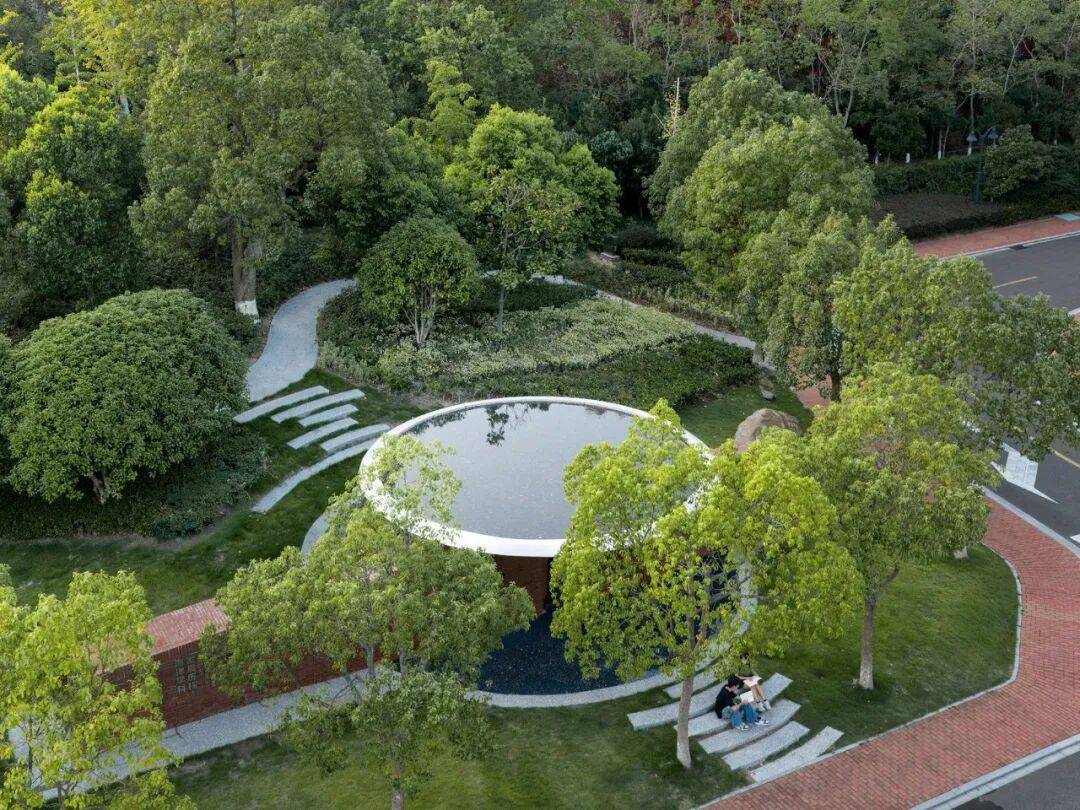 背面嵌入自然坡地 ©Chen Xi Studio 与场地的对话:一侧展示,一侧栖息 基于场地的双重属性,我们进一步强化了亭子的“双面”表达: 一道清水砖墙将圆形水盘托起,形成清晰的空间界定。 朝向校园人文轴线的一侧,墙体成为展示十五年院史的长卷,墙端圆形水盘中央,水流持续滑落,形成一道轻柔水幕。这一侧是外向的、精神的,是面向集体的文化呈现。 朝向自然山体的一侧,我们采用了截然不同的策略:通过一条穿过树林的缓径移步接近,被刻意压低的水盘使亭子从隐到显缓缓呈现;水盘倒映天光云影;亭内地面与座位嵌入微微隆起的坡地,与绿景相融,模糊了构筑物与自然的界限。这一侧是内向的、静谧的,是关于停驻与静思的邀请。 这种“一分为二”的处理,并非割裂空间,而是基于场地文脉的精准回应,使亭子同时承载纪念性与日常性的两种表情。