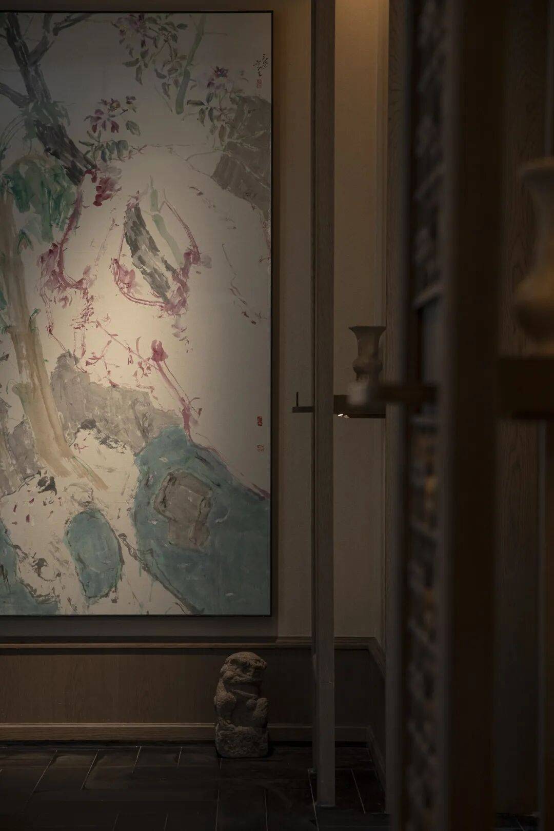 艺术画作:水墨为魂的时空对话 苏城家宴的空间不仅是建筑的容器,更是艺术的展场。本次升级特邀叶鸿平、夏回、孙宽三位江南代表性画家真迹入驻,其作品与园林空间、苏帮宴饮形成三重美学共振,让水墨成为流动的江南记忆。孙宽之画作,其美学理念聚焦着时空留白的园林诗学,以“无人之境”重构园林,褪色亭台隐于氤氲水墨中,空廊曲径无一人踪,却通过光影、残迹暗示琴音未散、茶烟未冷的文人雅集余韵,形成“近在咫尺的亲密与若即若离的恍惚”的独特意境。夏回之画作,则着眼于写意花鸟的生命律动,以“奔放处不离法度,细微处兼顾气魄”为内核,设色淡雅却蕴含贞润之气,将文人案头清供升华为对自然生命周期的诗意礼赞。叶鸿平的作品则弱化写实细节,以色彩与肌理重构菖蒲、银杏等文人雅物,赋予传统文化符号以现代视觉张力,其画作风格根植于江南文脉,却在传统与现代、具象与抽象之间构建了独特的视觉语言。画中亭台是凝固的宴席,席间光影是流动的水墨。苏城家宴以真迹为锚点,让每一次举箸都成为与江南文脉的隔空唱和。