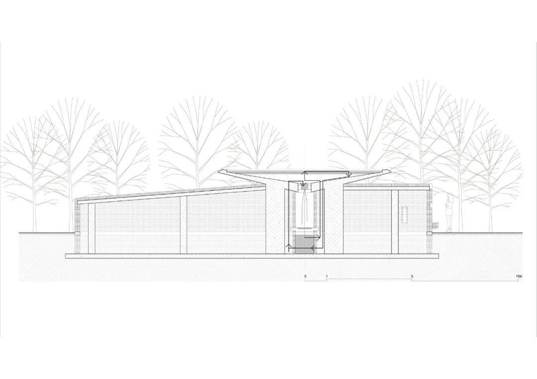 清水砖墙承托圆形水盘©Chen Xi Studio 方案完成深化设计后,学院第二次提出更换选址,二易其址的消息一度让我们感到沮丧,但经过对新场地的现场踏勘和分析,我们发现最终的场址呈现出意料之外的妙处: 这里一侧面向校园人文轴线,是处于图书馆与教学区之间的重要节点;另一侧则背靠自然山体坡地,林木葱郁,氛围幽静。场地呈现出的“双面性”使其成为连接人文与自然、路径与目的地的交汇点。它既坐落在师生的日常动线上,又提供了转向自然、短暂抽离的契机——亭子在此自然成为连接两种校园体验的枢纽。