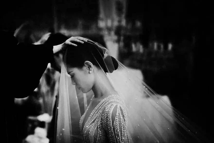 婚礼照片中,周围的黑色调与新娘的白色裙纱形成鲜明对比,仿佛黑暗中的一束光,纯净而夺目。