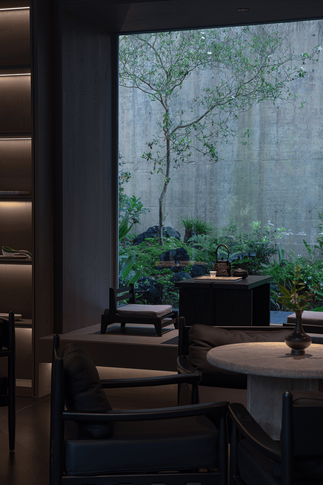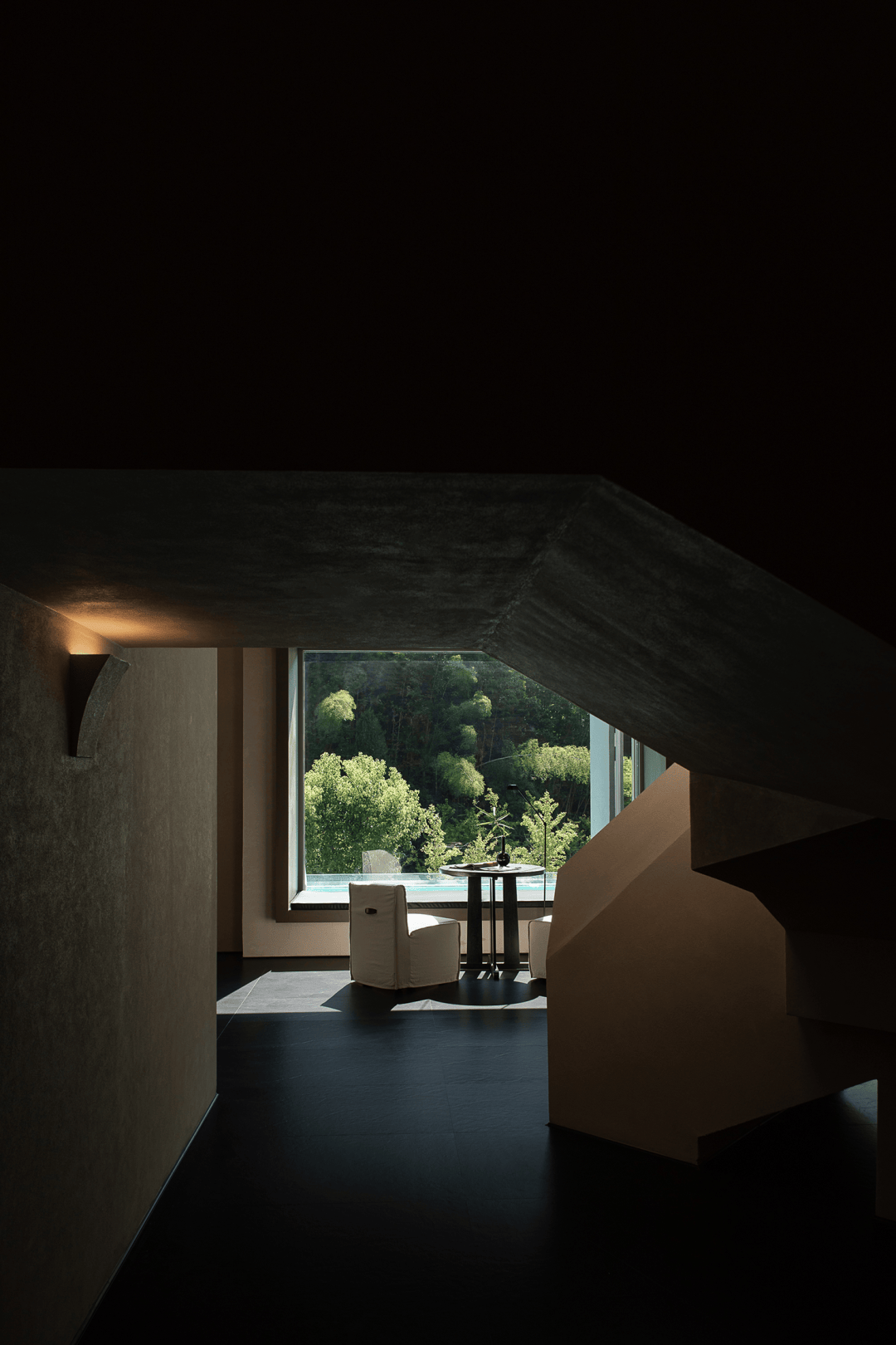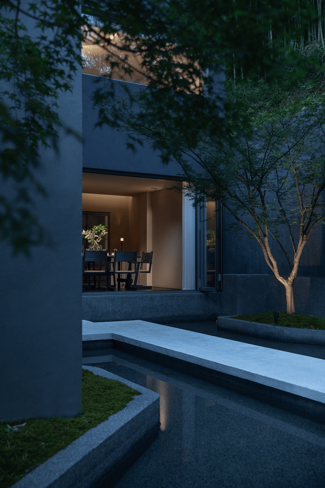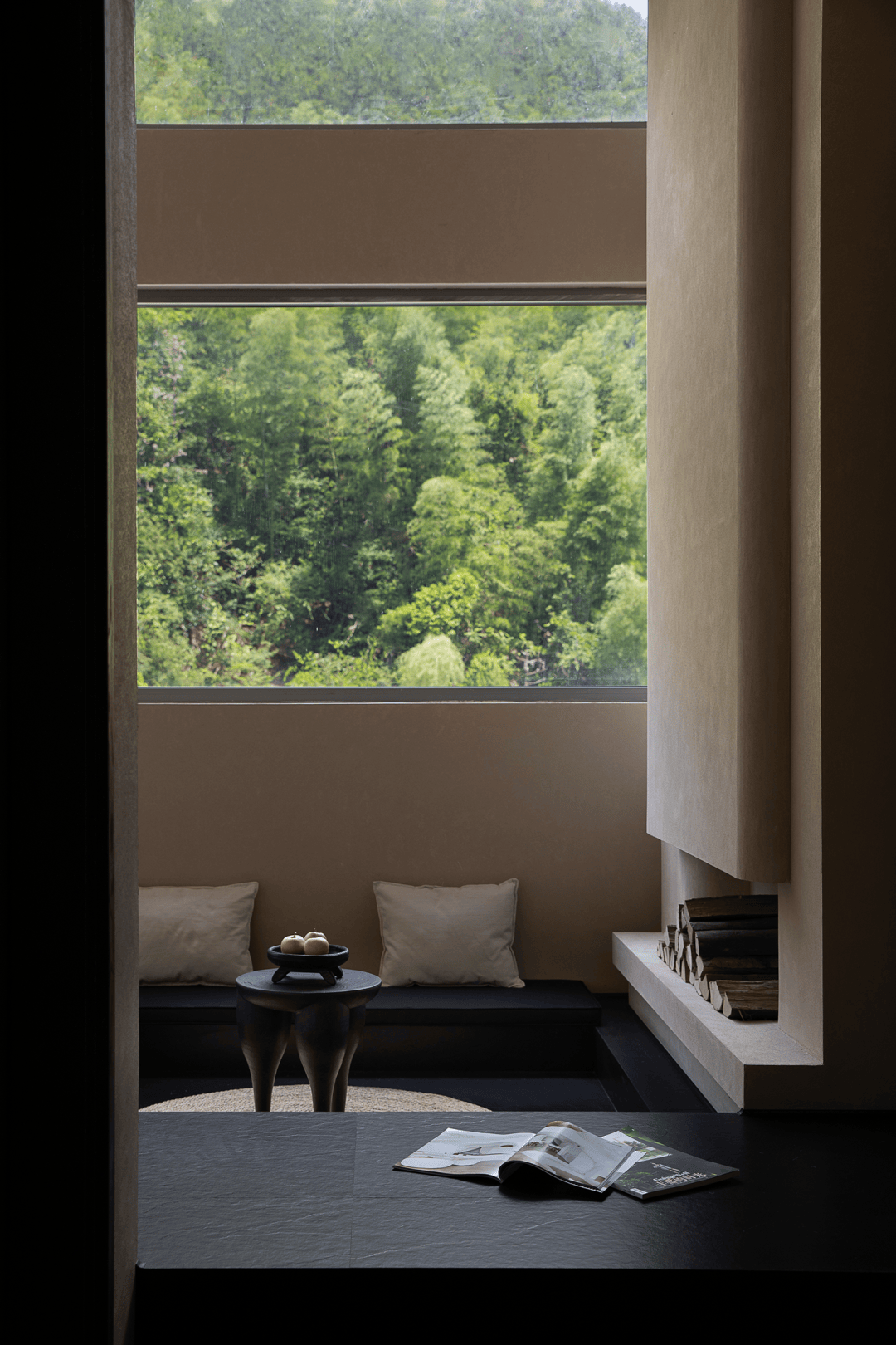 正午,光线穿透玻璃,落在微水泥的墙面上,拖曳出长长的、随时间缓慢游走的投影,仿佛时间本身也有了质感;暮色,当远山沉入黛青,室内的暖光灯火如萤虫般轻轻亮起,温厚而笃定。