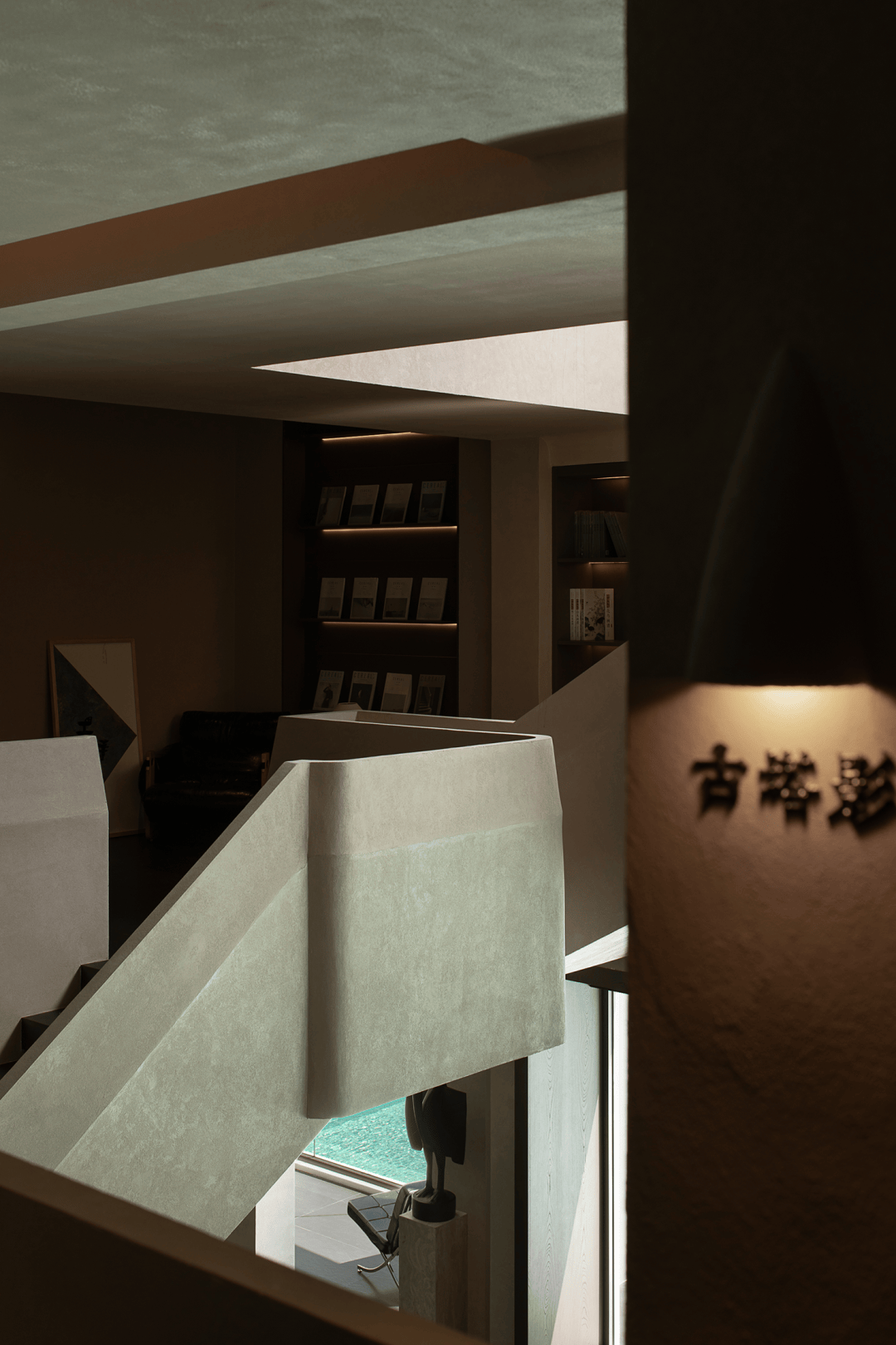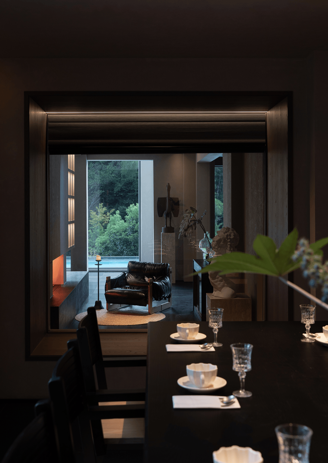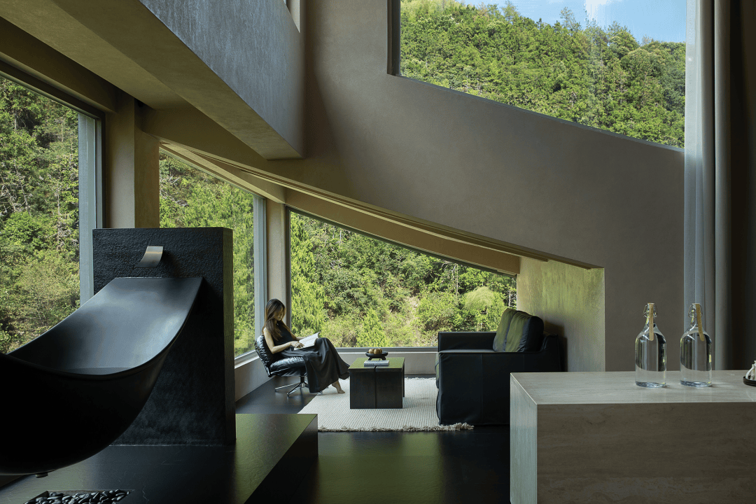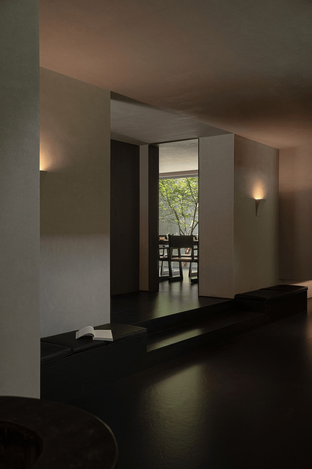 正午,光线穿透玻璃,落在微水泥的墙面上,拖曳出长长的、随时间缓慢游走的投影,仿佛时间本身也有了质感;暮色,当远山沉入黛青,室内的暖光灯火如萤虫般轻轻亮起,温厚而笃定。