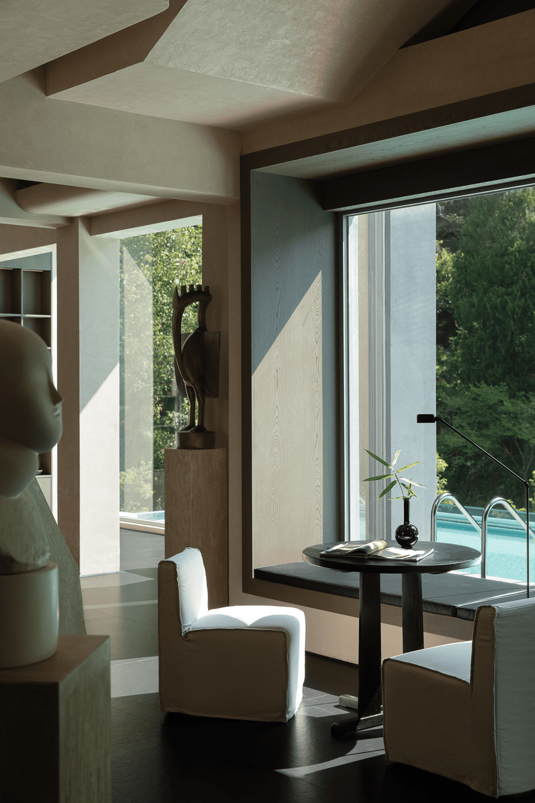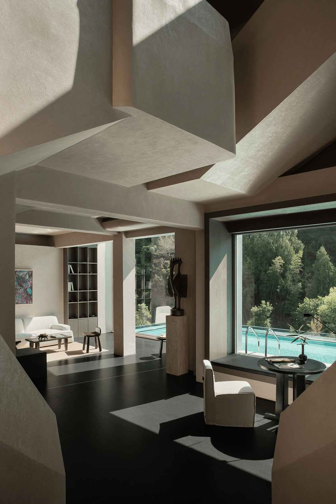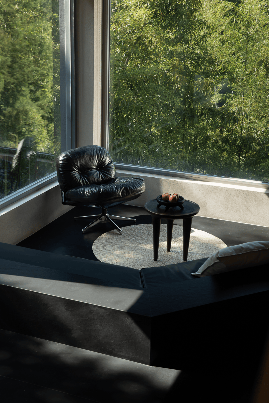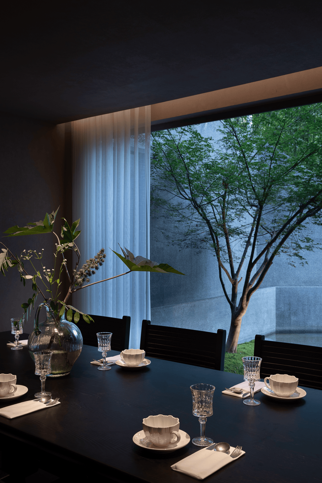 正午,光线穿透玻璃,落在微水泥的墙面上,拖曳出长长的、随时间缓慢游走的投影,仿佛时间本身也有了质感;暮色,当远山沉入黛青,室内的暖光灯火如萤虫般轻轻亮起,温厚而笃定。