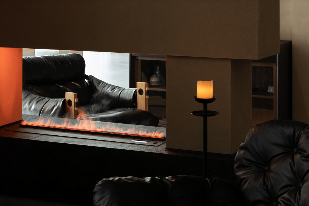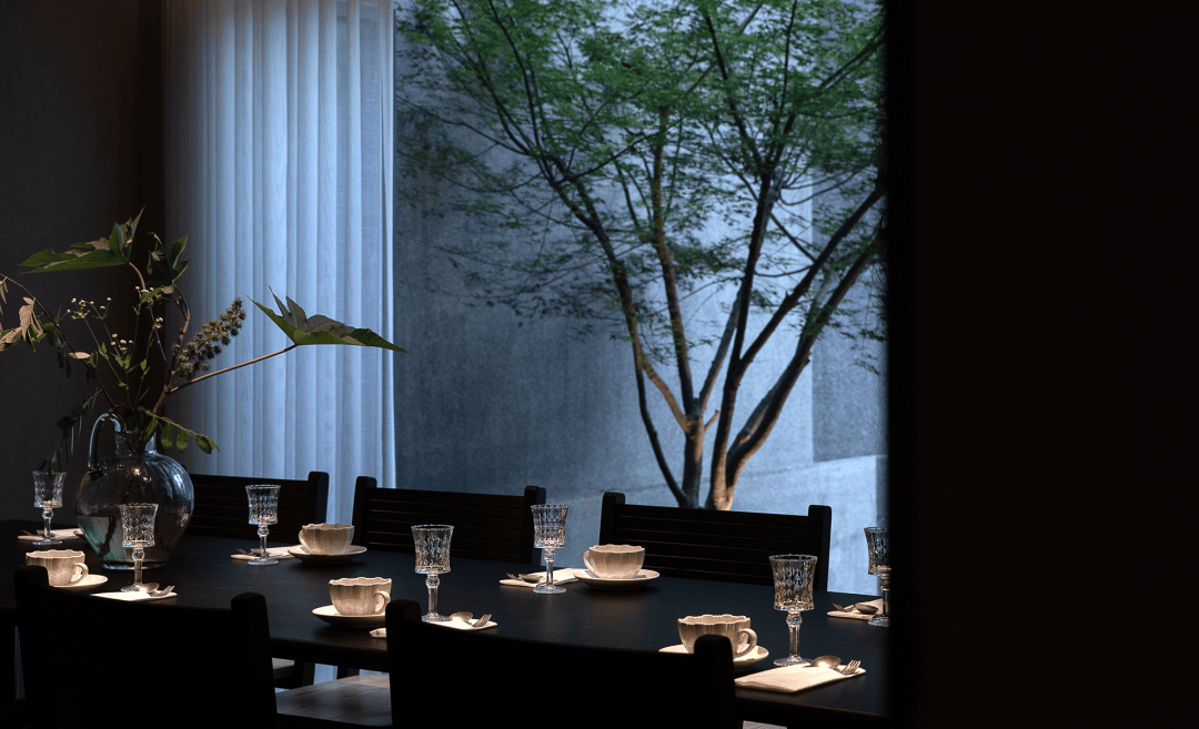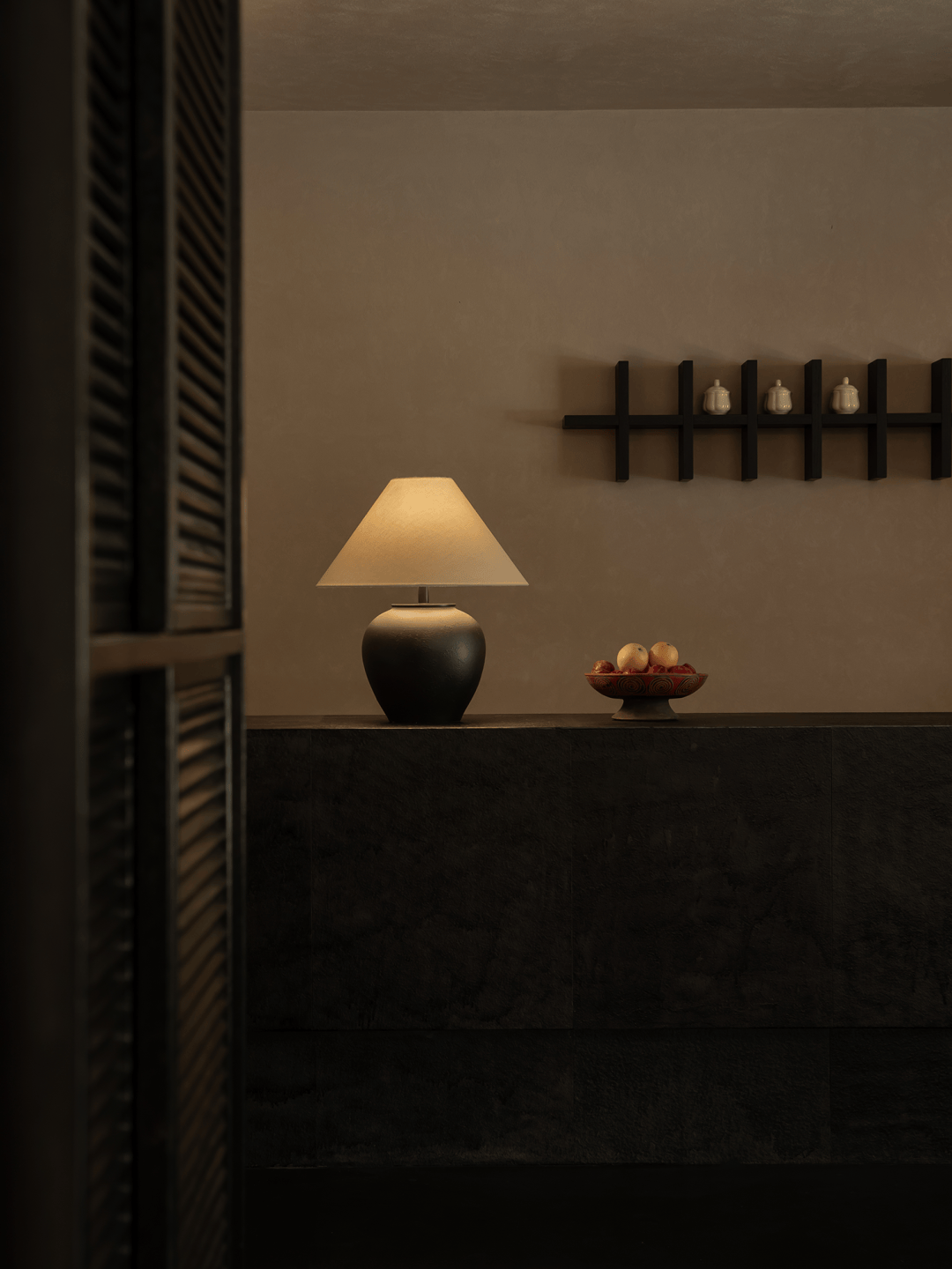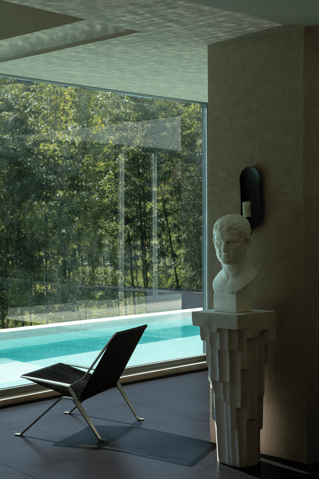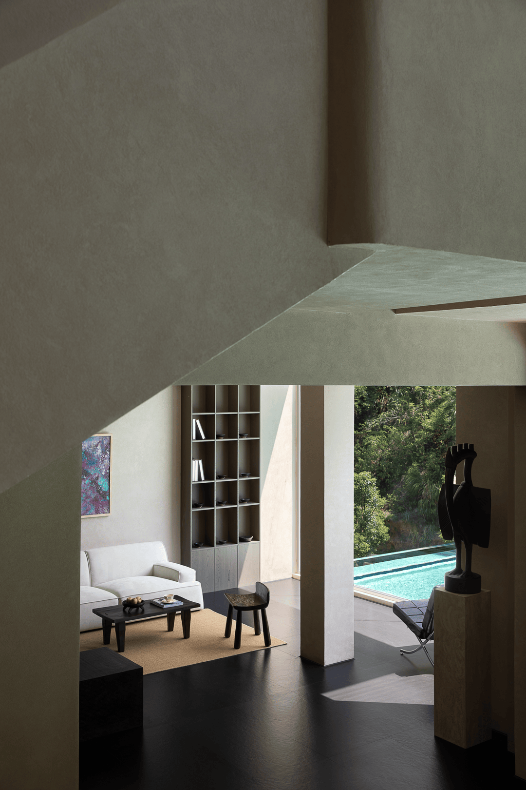 正午,光线穿透玻璃,落在微水泥的墙面上,拖曳出长长的、随时间缓慢游走的投影,仿佛时间本身也有了质感;暮色,当远山沉入黛青,室内的暖光灯火如萤虫般轻轻亮起,温厚而笃定。