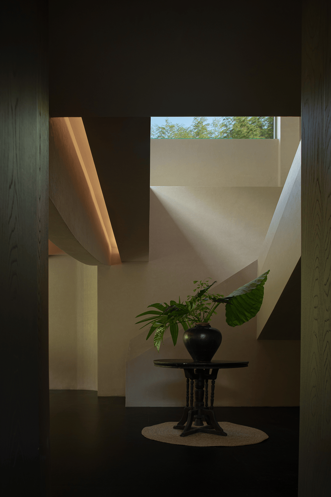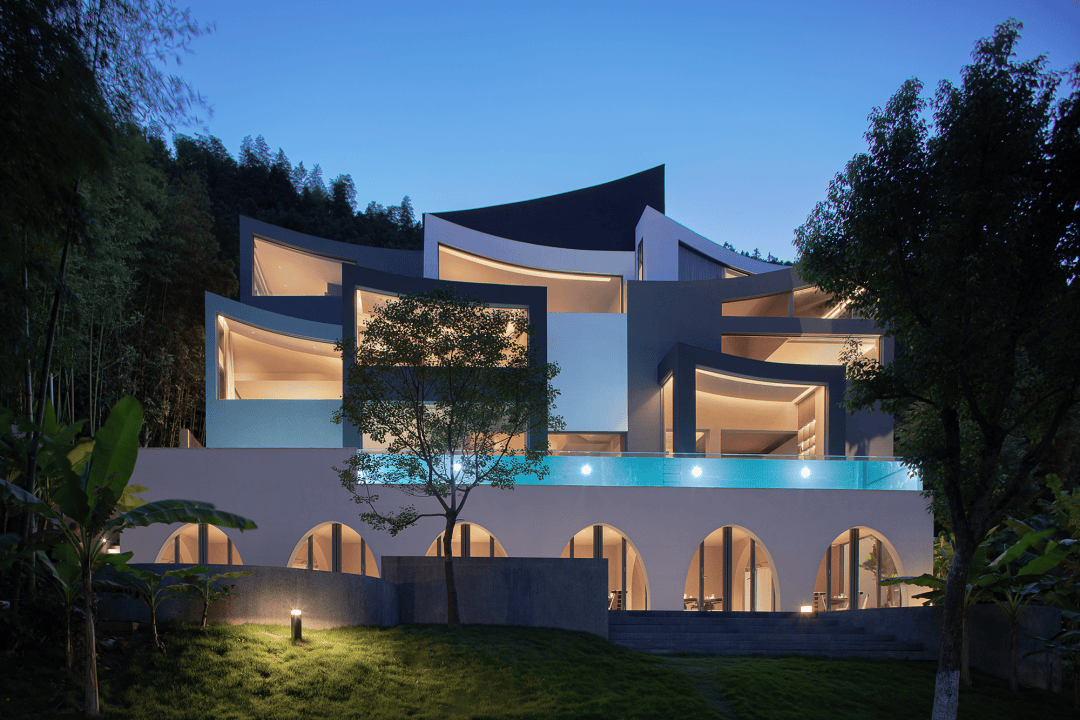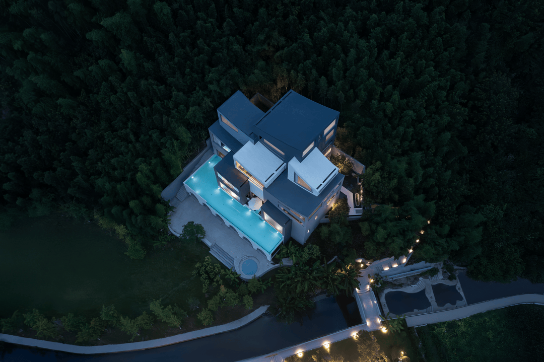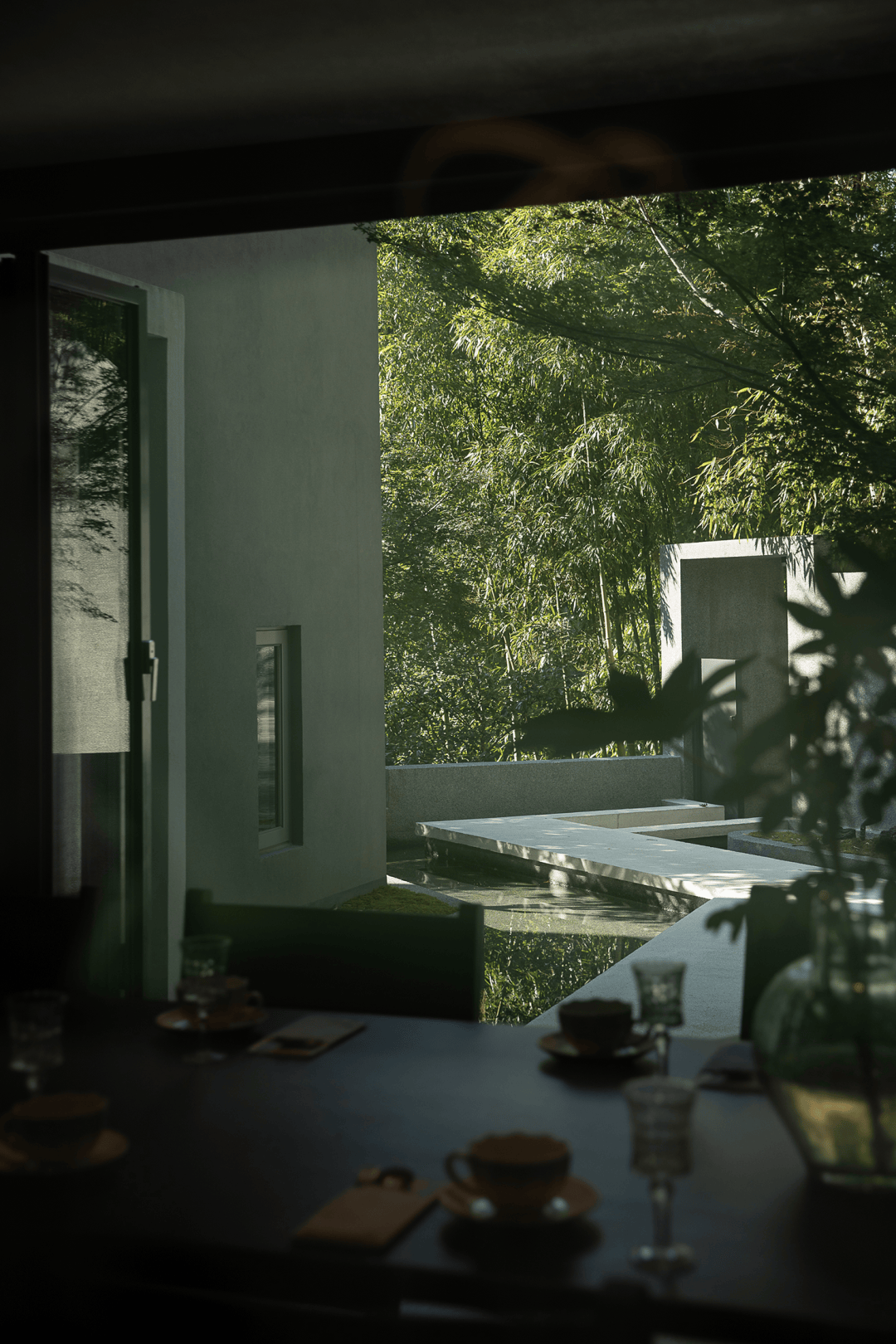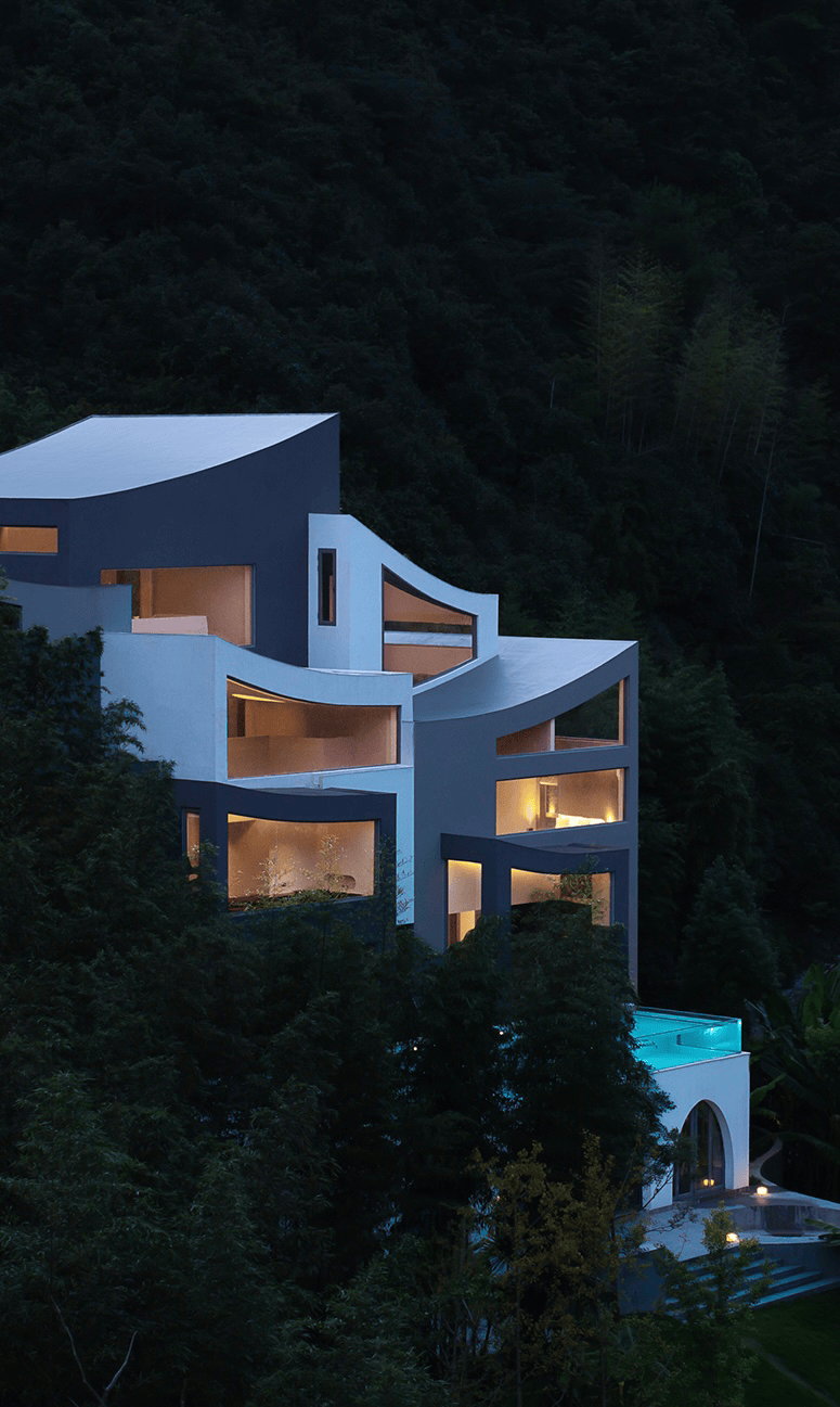 风动,影随,心安。 01. 从笔墨山水 到当代栖居的空间转译 从远山深处回望,建筑的轮廓以一种近乎冷峻的极简几何,克制地消融在竹海的波涛里。白与灰的色调,如宣纸上的淡墨,与深绿的山、浅蓝的天,构成了一种清冷而宁静的对比。