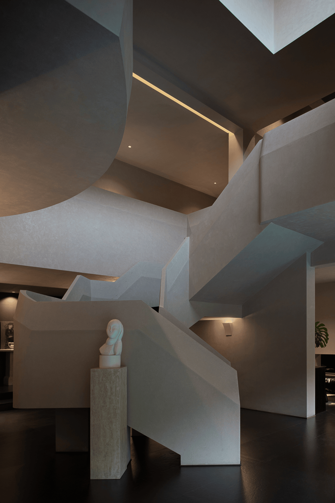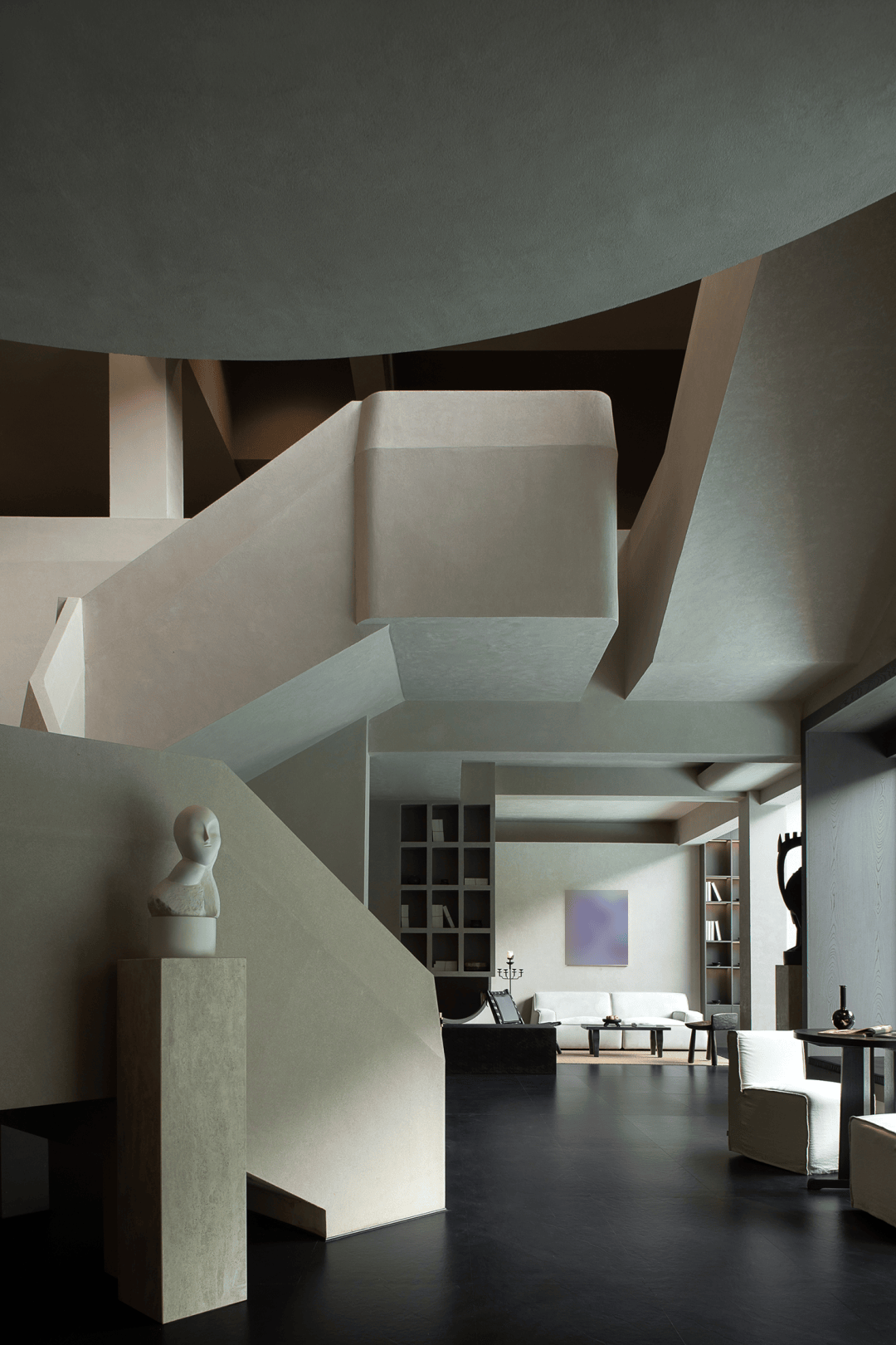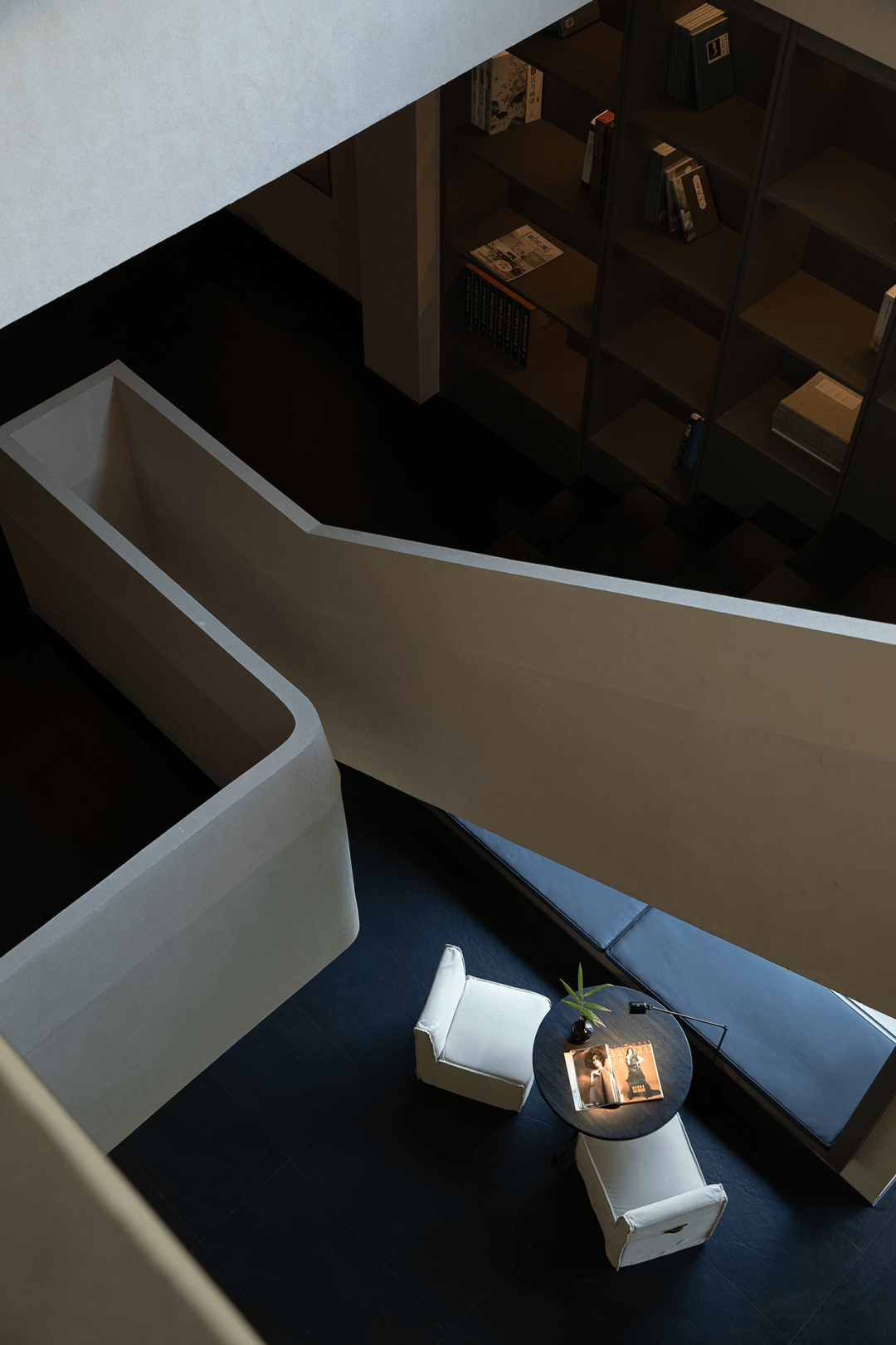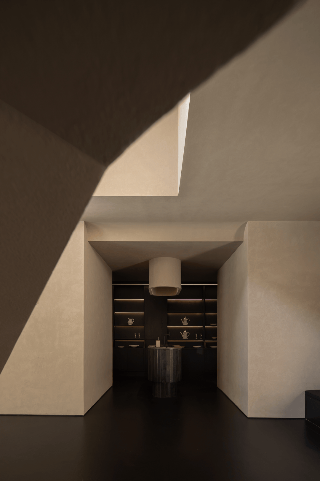 02. 设计剥离了喧嚣的装饰 转而向材质与触感索取灵魂 整座空间如同覆上了一层薄薄的霜雪,以低饱和度的自然色系铺陈,微水泥的墙面带着细腻而连续的灰度,在光影的抚摸下显现出近乎丝绸般的肌理,捕捉着每一寸流逝的时间。