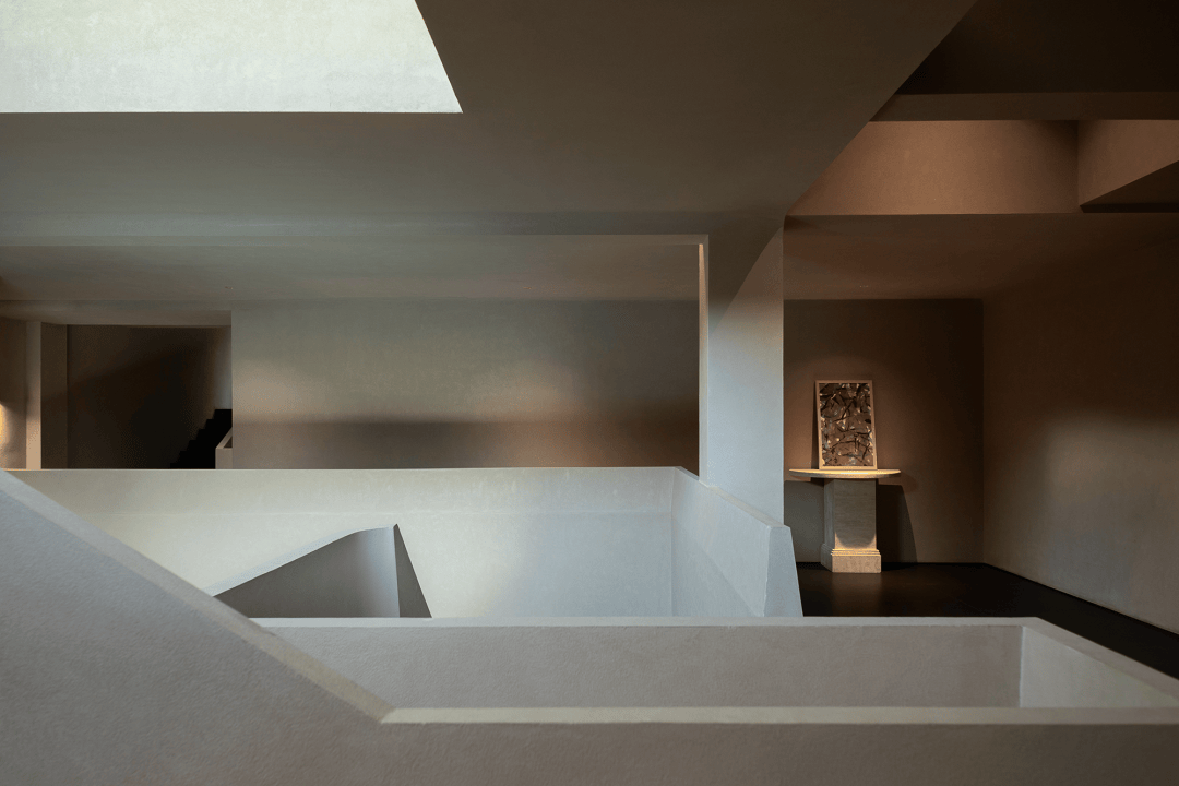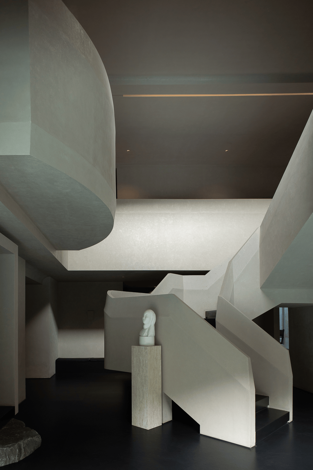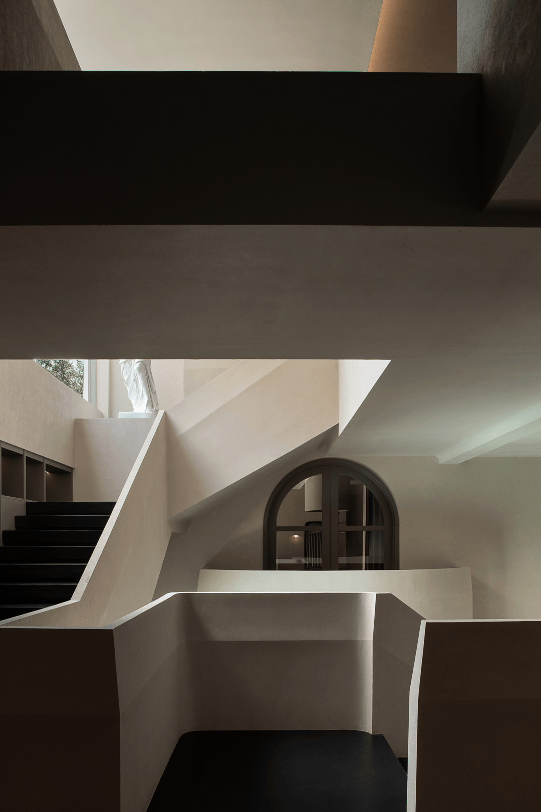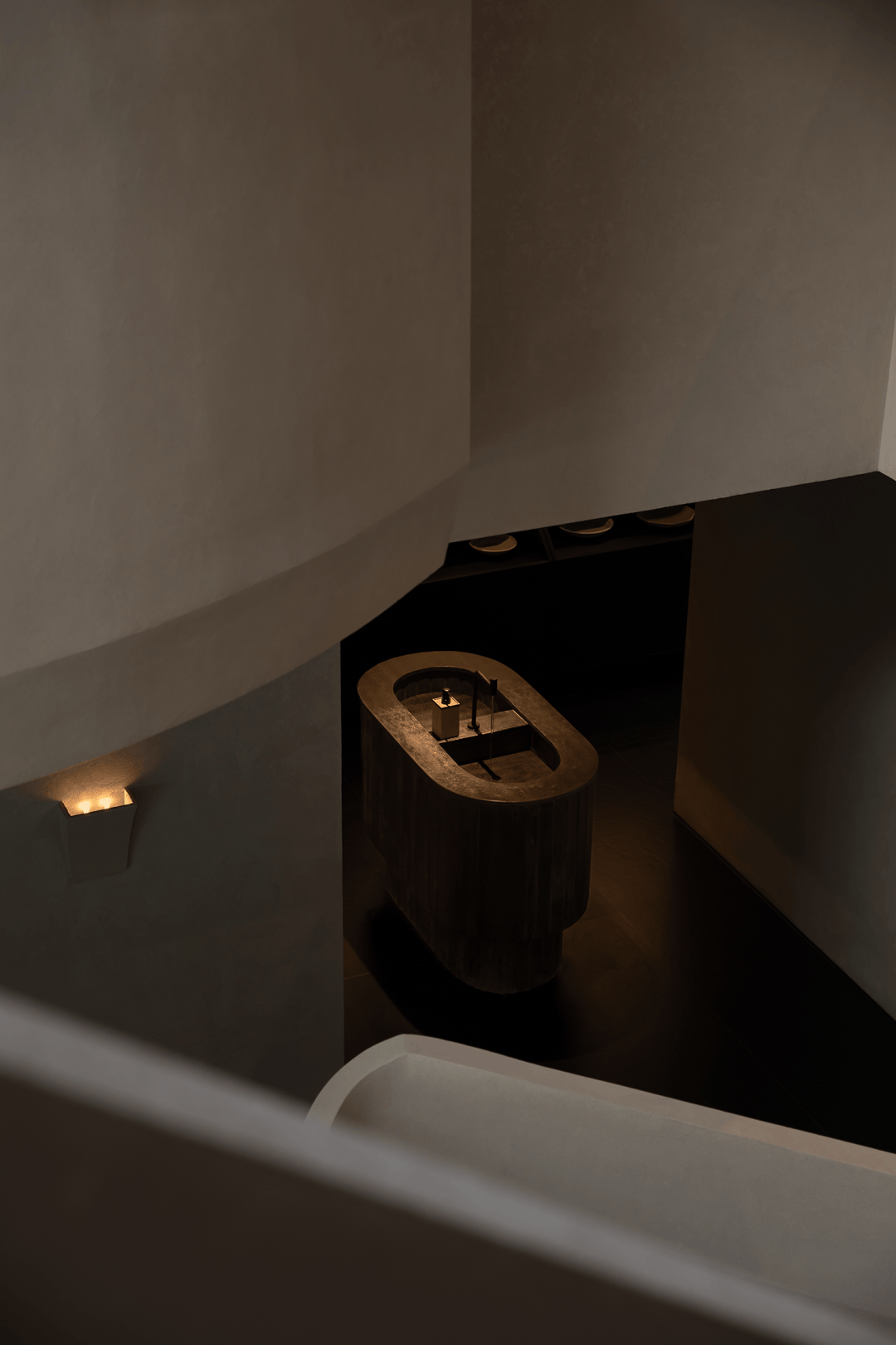02. 设计剥离了喧嚣的装饰 转而向材质与触感索取灵魂 整座空间如同覆上了一层薄薄的霜雪,以低饱和度的自然色系铺陈,微水泥的墙面带着细腻而连续的灰度,在光影的抚摸下显现出近乎丝绸般的肌理,捕捉着每一寸流逝的时间。