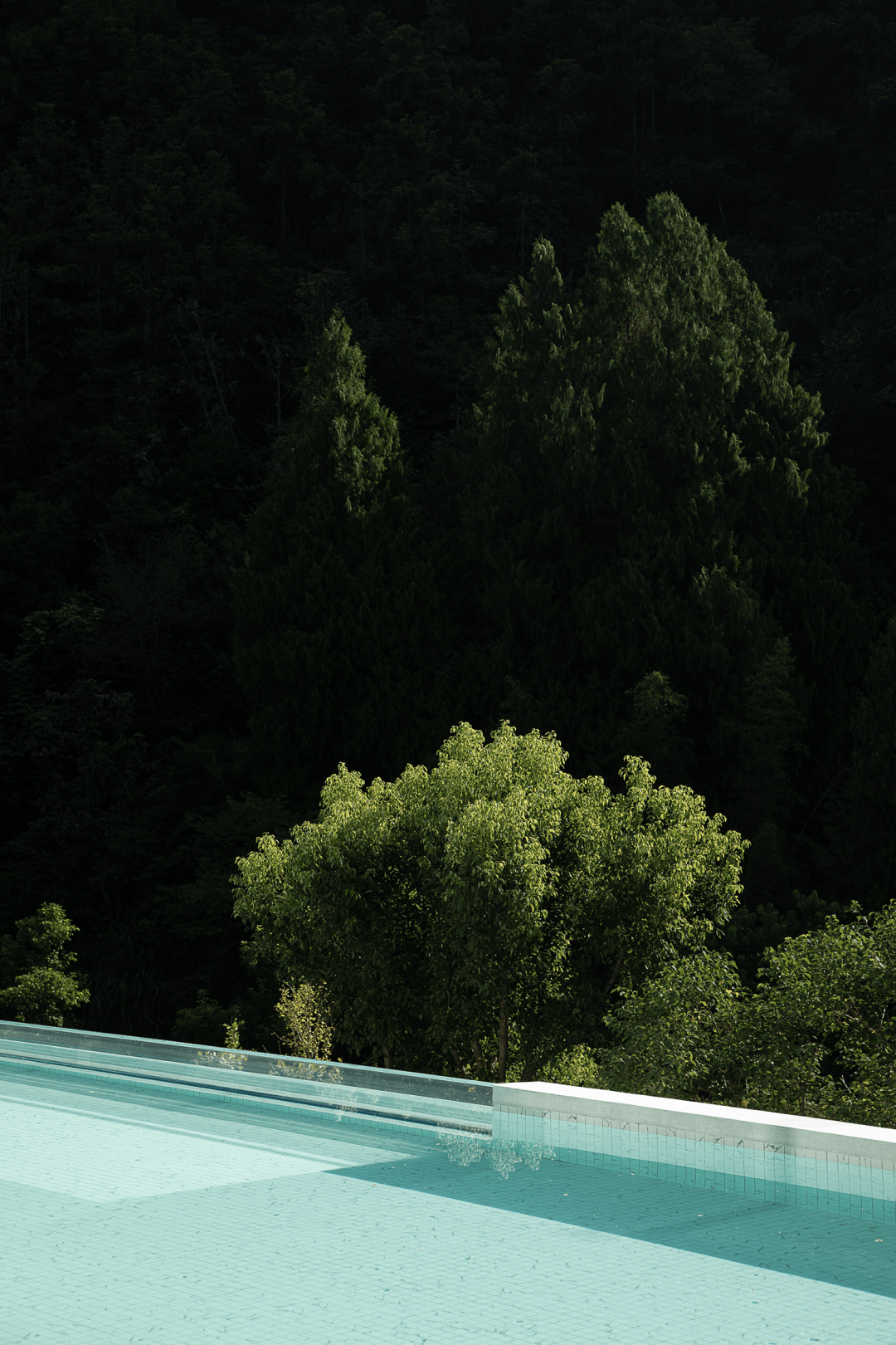 在这幅流动的山水画中,几处简洁的几何体量,以一种近乎虔诚的姿态,静静依偎在竹林与山坡的起伏之间。
