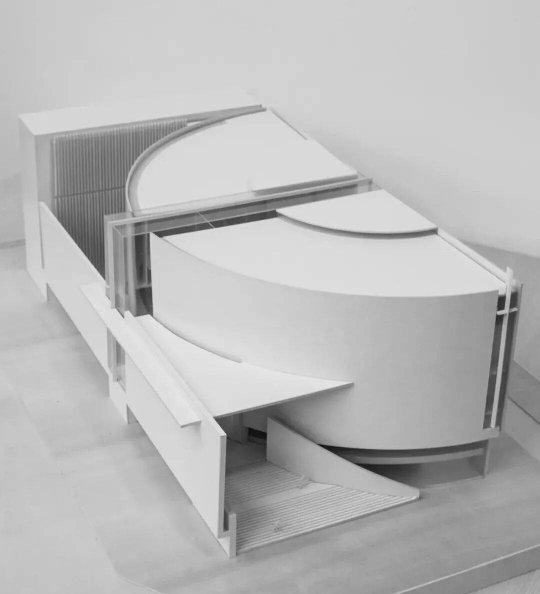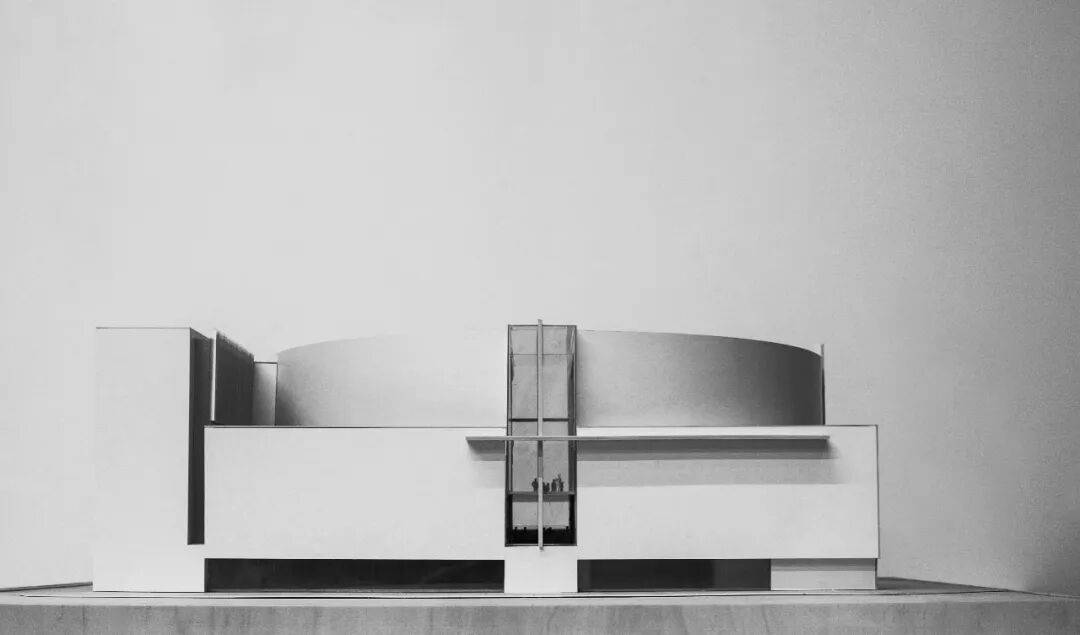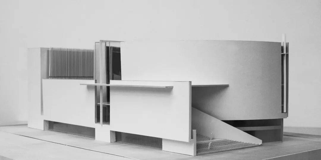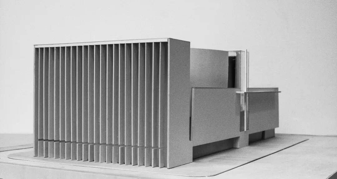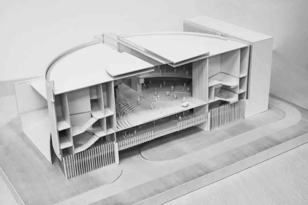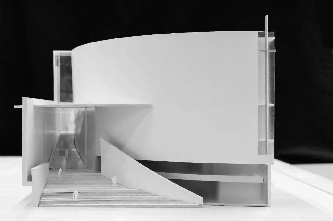 ▲基督教珠海堂实体模型 建筑主体以混凝土灰为主色调,利落的几何线条与柔和的弧形曲面交织,构成有特色且具整体感的外部造型。混凝土墙与玻璃幕墙形成强烈的虚实对比,竖向的格栅肌理丰富了细节层次,亦消解了疏离感。