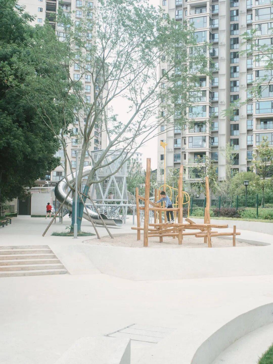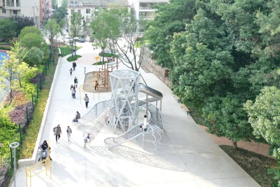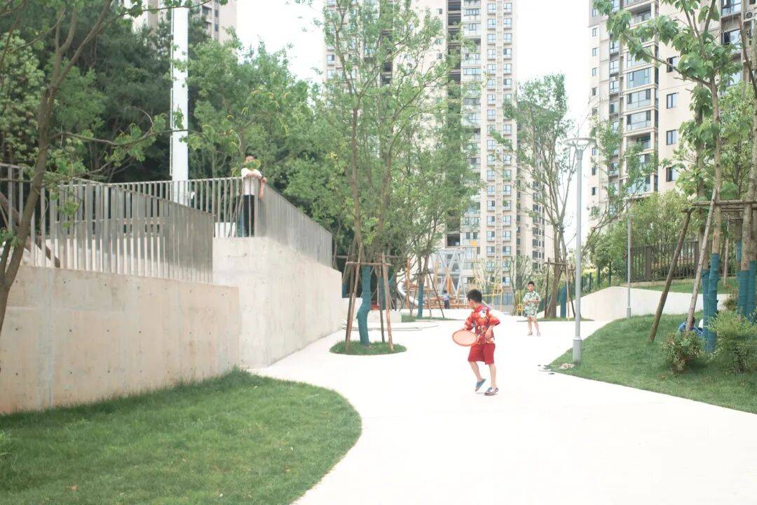 ▲主通道游乐区© 鲁胤希 为化解场地内复杂的高差变化,设计利用山丘与建筑之间的空地,在西南侧布置了一系列不断抬升的小广场与运动场地,逐步消化约3米的高差;同时采用回收混凝土块和砖块,以铁丝网包裹制成石笼挡土墙。在两个主要入口处,沿山体设置高低错落的休憩平台,借助地形高差营造视线与动线的交织互动。整体设计旨在为周边社区和学校提供最大程度的包容性,满足不同年龄与背景人群的使用需求,在闹市中打造一个亲切友好、易于亲近自然的聚集场所。公园通过巧妙布置无障碍坡道,为各年龄段市民提供安全、多元的游玩机会,也方便轮椅使用者轻松进入并探索大部分区域。