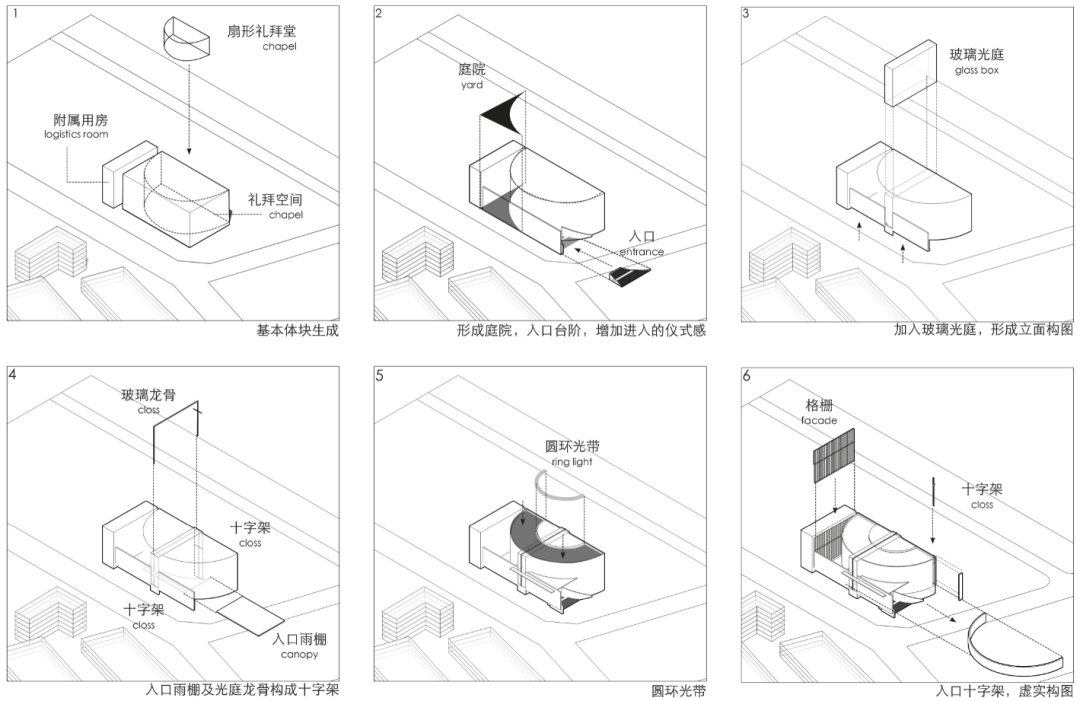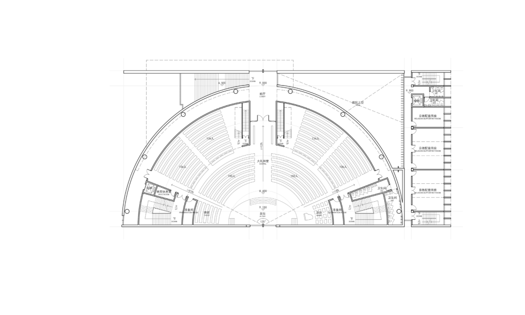 ▲教堂入口平台 在功能设计上,设计团队兼顾了实用性与舒适性:合理的空间布局最大化提升了场地实用率,通透的开窗设计保障了内部空间的自然通风与采光。无论是可容纳千人的大礼拜堂,还是更具私密性的小礼拜堂,都能让身处其中者在舒适中获得内心的安宁。