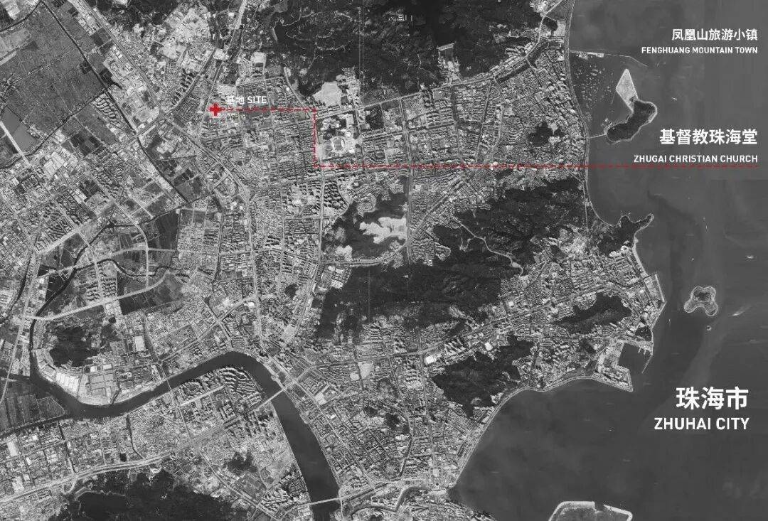 ▲基督教珠海堂 01. 城市语境下的空间定位 基督教珠海堂选址香洲区梅华西路北侧、金凤路东侧,所属片区规划为凤凰山旅游小镇,是珠海文旅融合与城市生活功能耦合的核心发展板块。