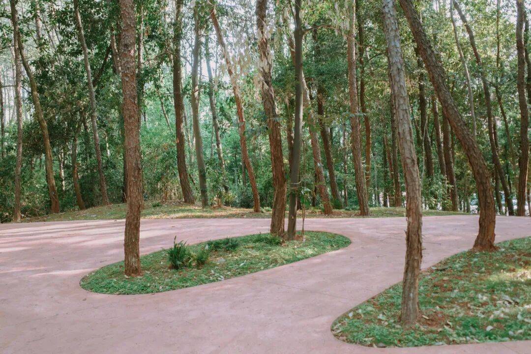 ▲树池依势定形© 鲁胤希 为了保护深受喜爱的现有松林,设计并未对每棵树进行精确测绘,也避免预先在图纸上划定林间路径,而是因地制宜地采取现场定线方式。施工人员与当地工人一同手持白色滑石粉,在松林中就地划线、标记路线,随后对局部过陡的坡度进行处理。这一过程最终形成的道路图案,带有一种马蒂斯式的天真趣味。