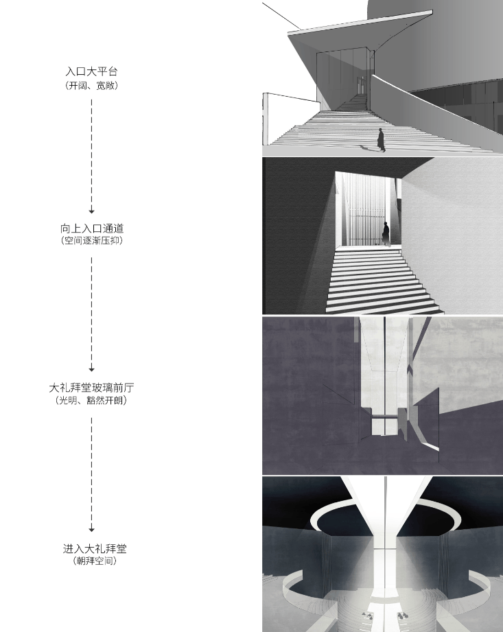 ▲空间体验:人的空间感受随着进入不同的空间发生变化,产生空间仪式感 从城市道路步入场地,建筑入口大台阶缓缓抬升,沿入口拾级而上,尺度有序收放,光影动态流转,使用者在过渡中自然完成心理状态的沉淀,获得沉浸式的空间体验。