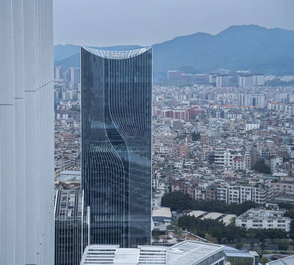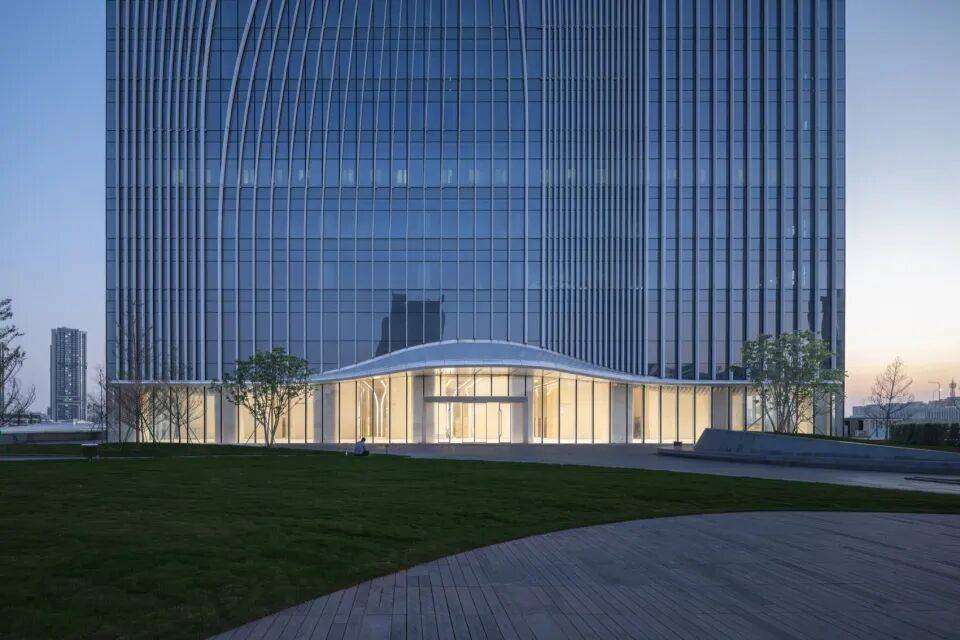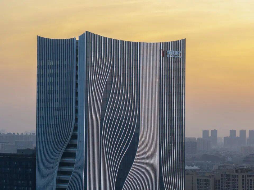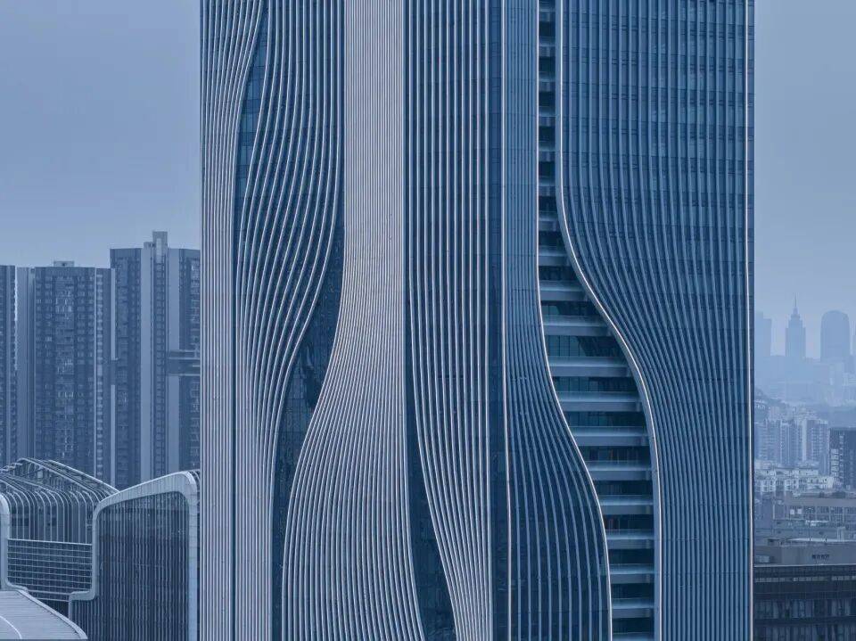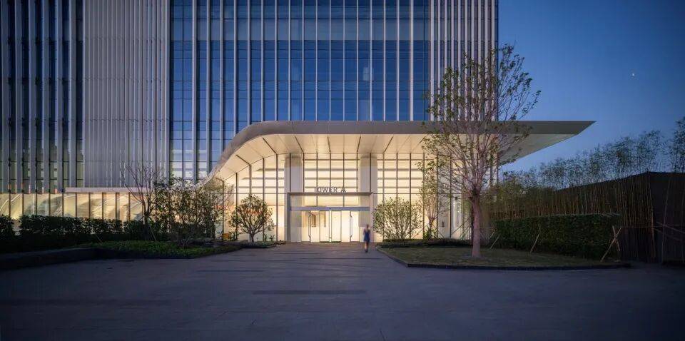 05. 品控一体化策略与整体性设计 项目实施全维度品控一体化策略,对建筑、景观、室内、灯光、幕墙整体效果进行一体化控制。通过精细化设计把控建筑细节,对技术工艺进行严格要求和控制,如塔楼立面转折与收边节点采用高精度压弯金属构件,实现流畅的曲面过渡。因构件转折参数各异,且金属冷弯存在回弹效应,常规工艺易导致线条断裂、曲面失真。设计团队与制造方协同研发预反变形控制工艺,通过模拟回弹量、并设置多向调节构件等方式,最终实现数百块异形单元的无缝拼接。 ▼鸟瞰 © 邹林(阿尔法摄影)
