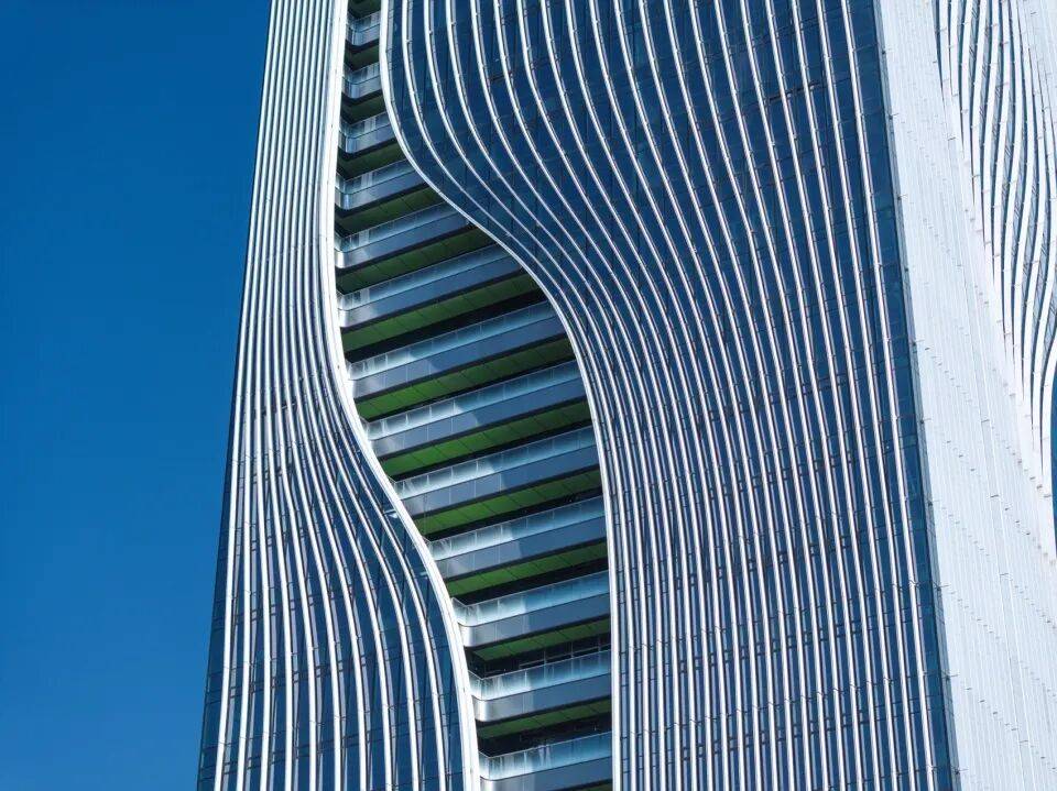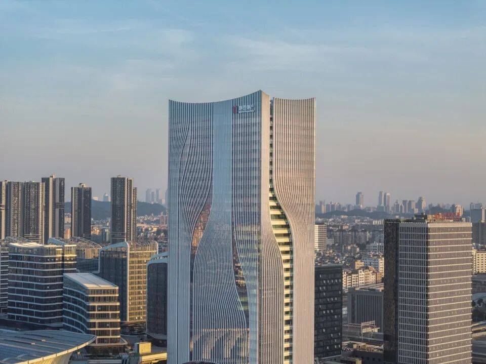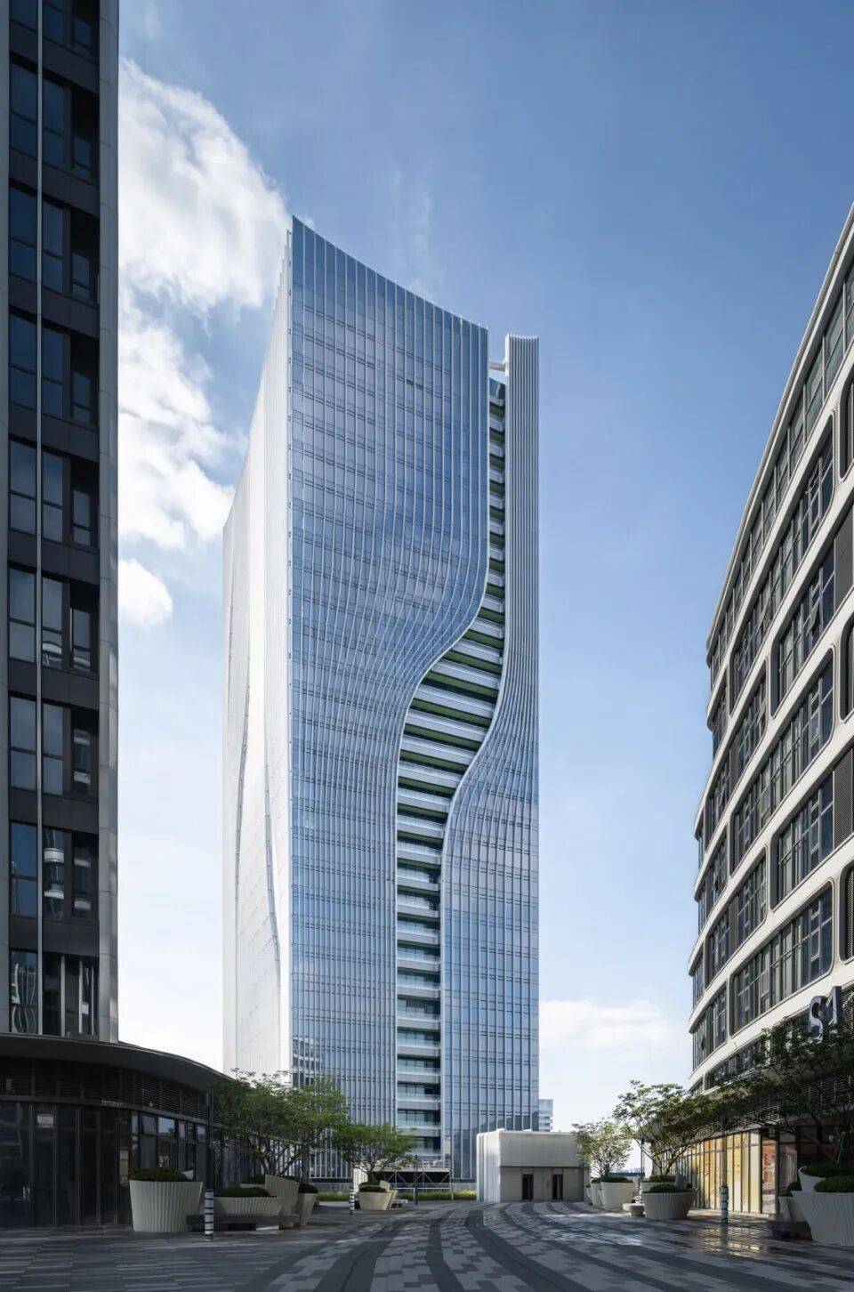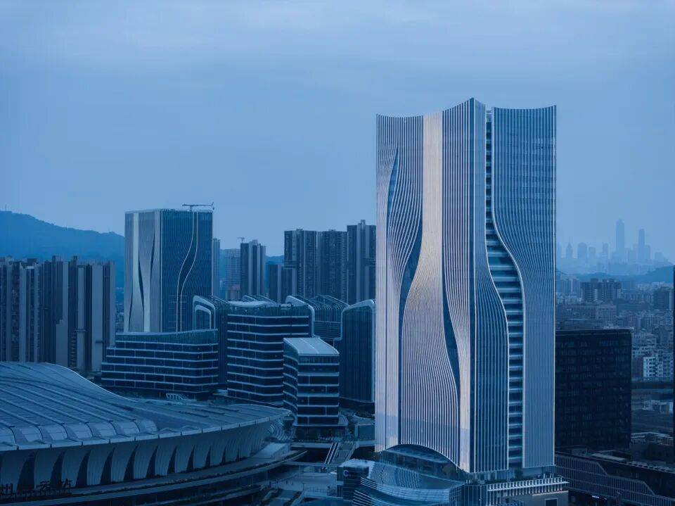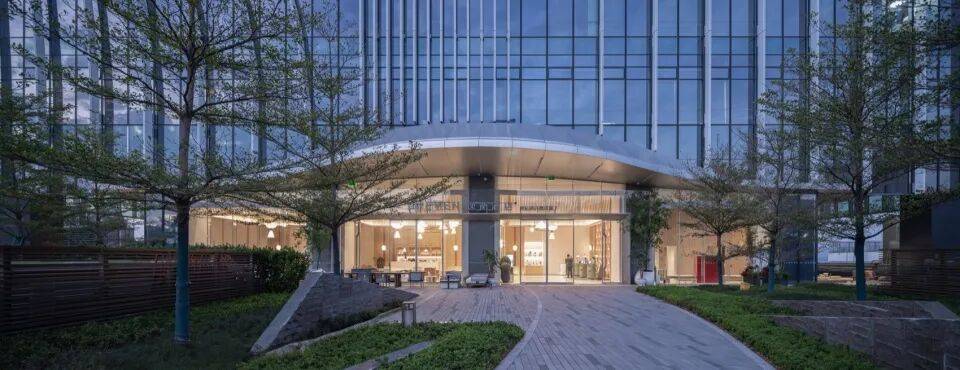 05. 品控一体化策略与整体性设计 项目实施全维度品控一体化策略,对建筑、景观、室内、灯光、幕墙整体效果进行一体化控制。通过精细化设计把控建筑细节,对技术工艺进行严格要求和控制,如塔楼立面转折与收边节点采用高精度压弯金属构件,实现流畅的曲面过渡。因构件转折参数各异,且金属冷弯存在回弹效应,常规工艺易导致线条断裂、曲面失真。设计团队与制造方协同研发预反变形控制工艺,通过模拟回弹量、并设置多向调节构件等方式,最终实现数百块异形单元的无缝拼接。 ▼鸟瞰 © 邹林(阿尔法摄影)