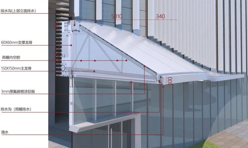 塔楼主入口作为城市门户第一界面,是建筑立面叙事向地面的自然延伸,方案采用雨棚 — 立面 — 泛光一体化设计策略,以连续曲面形成导向性与欢迎感兼具的入口序列。四座塔楼的雨棚在统一语言下呈现差异化表达:入口门把手线条提炼建筑立面的流动元素,与雨棚曲线相呼应。 ▼雨棚剖透视图 © 华南理工大学建筑设计研究院有限公司
