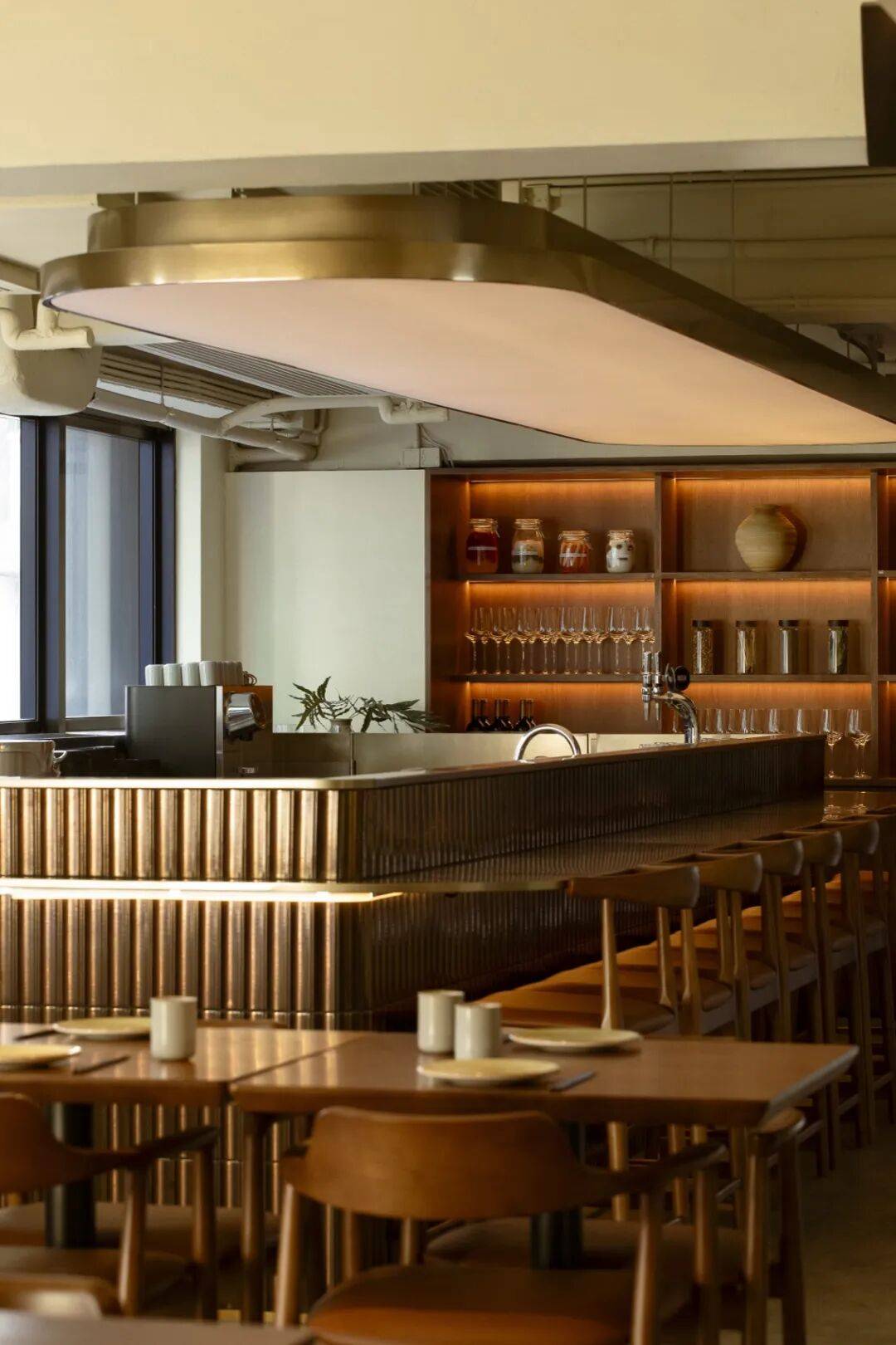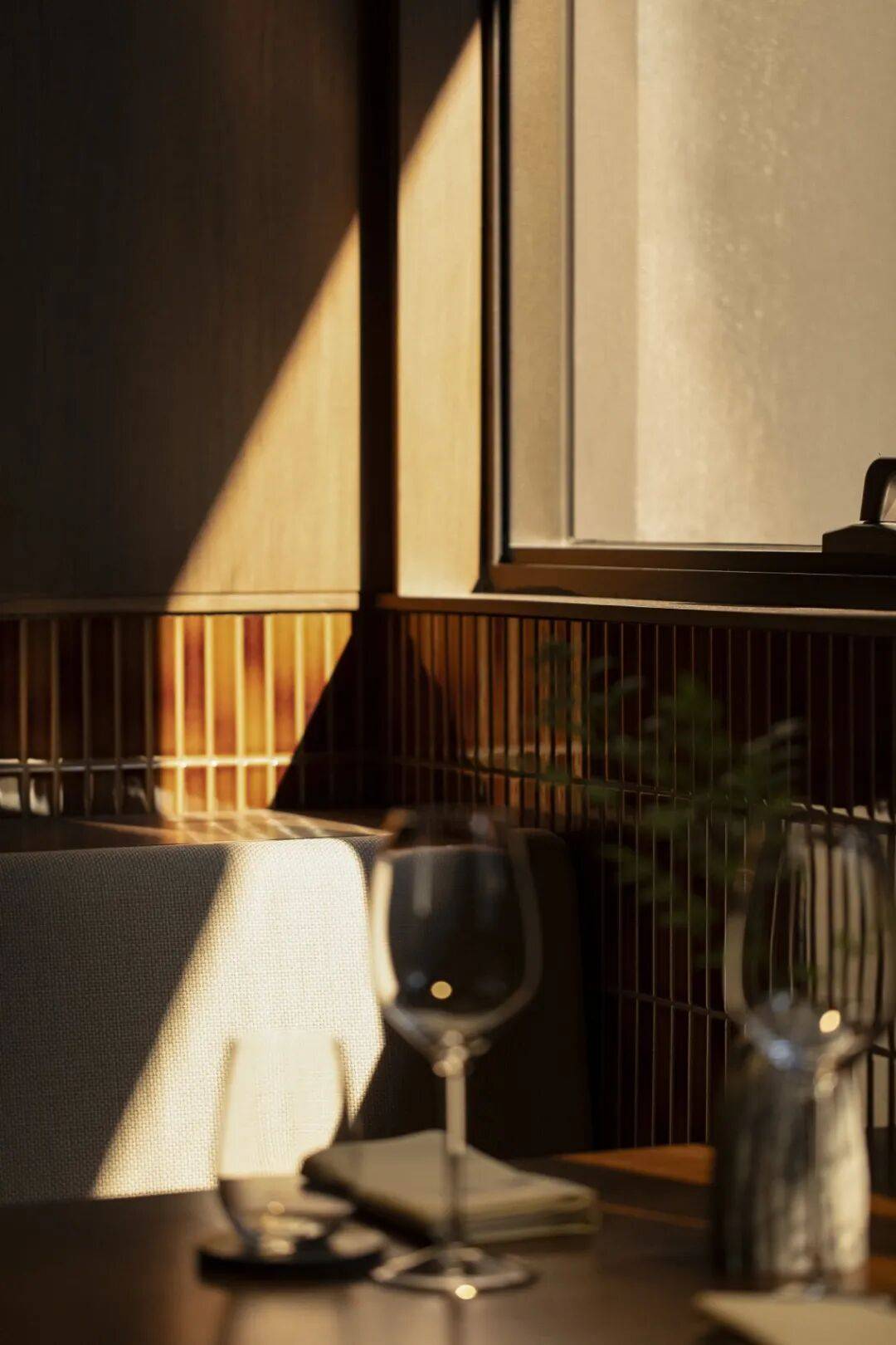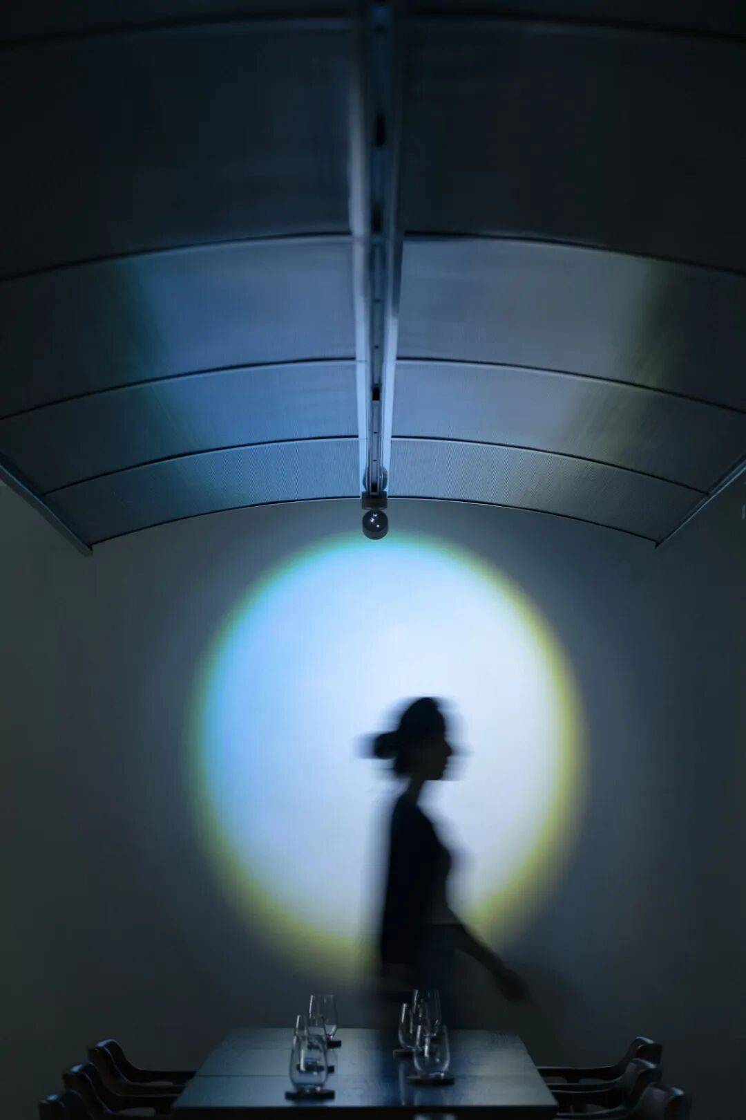 ▲两组雕塑性的灯光装置© Harold de Puymorin 主用餐区通过精心布置的餐桌营造出亲密的氛围。强化这一放松体验的,是空间的标志性元素——内凹的天花。其柔和的曲面既能漫射自然光与环境光,也使空间弥漫温暖柔和的光感。该形态呼应太阳在天空中的弧线轨迹,以一种富有诗意的方式强化自然循环的概念。隐藏的线性LED灯带沿曲线布置,模拟阳光与月光的运动,营造出层次丰富且具有画面感的光影效果,并随日光变化不断演变。这一建筑特征提升了整体餐饮体验,营造出一个适合聚会、用餐与庆祝季节更替的空间。