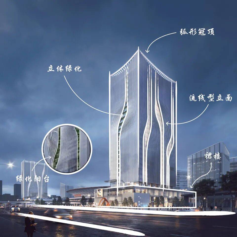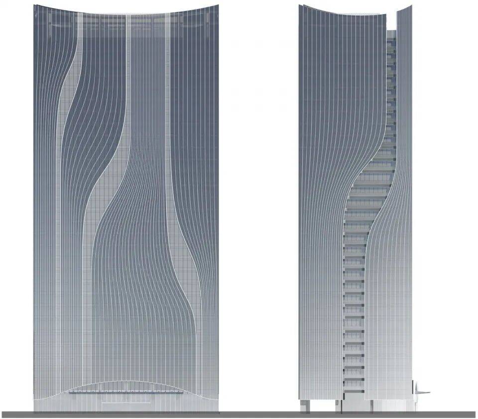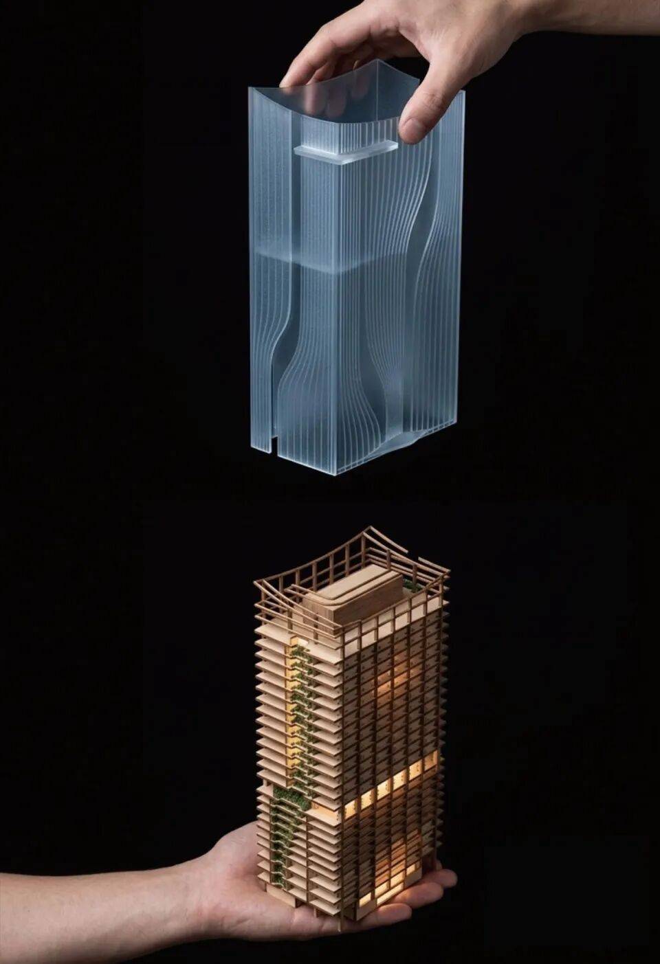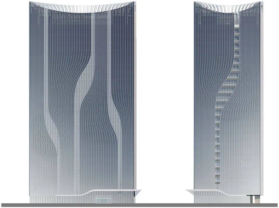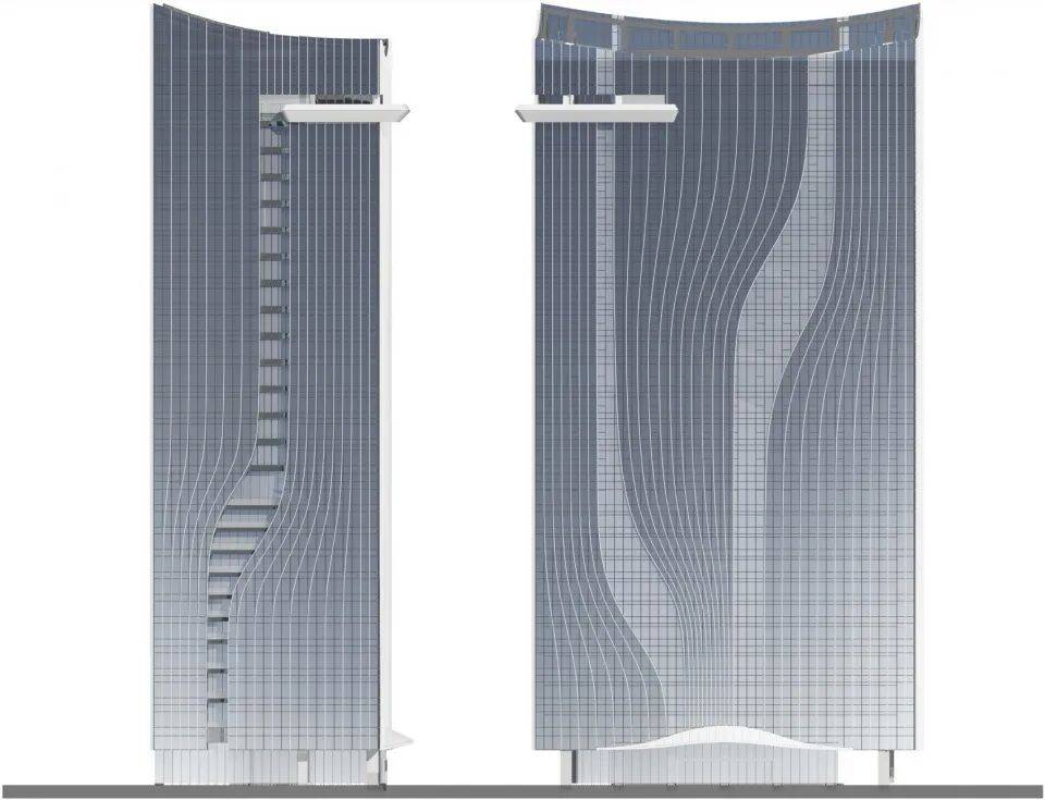 02. 叙事性形体:城市更新新范式——轨道肌理与山水的结合 塔楼以建筑语言诠释交通枢纽与城市环境的关联,打造动态视觉叙事体系。建筑以 “水润木棉・轨韵生形” 为设计内核,萃取高铁轨道曲线、白云山的自然山水,凝练自然、交通与地域文化的建筑设计语言,重塑交通枢纽上盖建筑的叙事逻辑。通过竖向金属构件模拟铁轨动感轨迹,赋予建筑速度感与流动感。设计整体的格局与肌理在片区城市更新中形成独特标识,成为片区未来设计方向的标杆。 ▼体块生成分析 © 华南理工大学建筑设计研究院有限公司