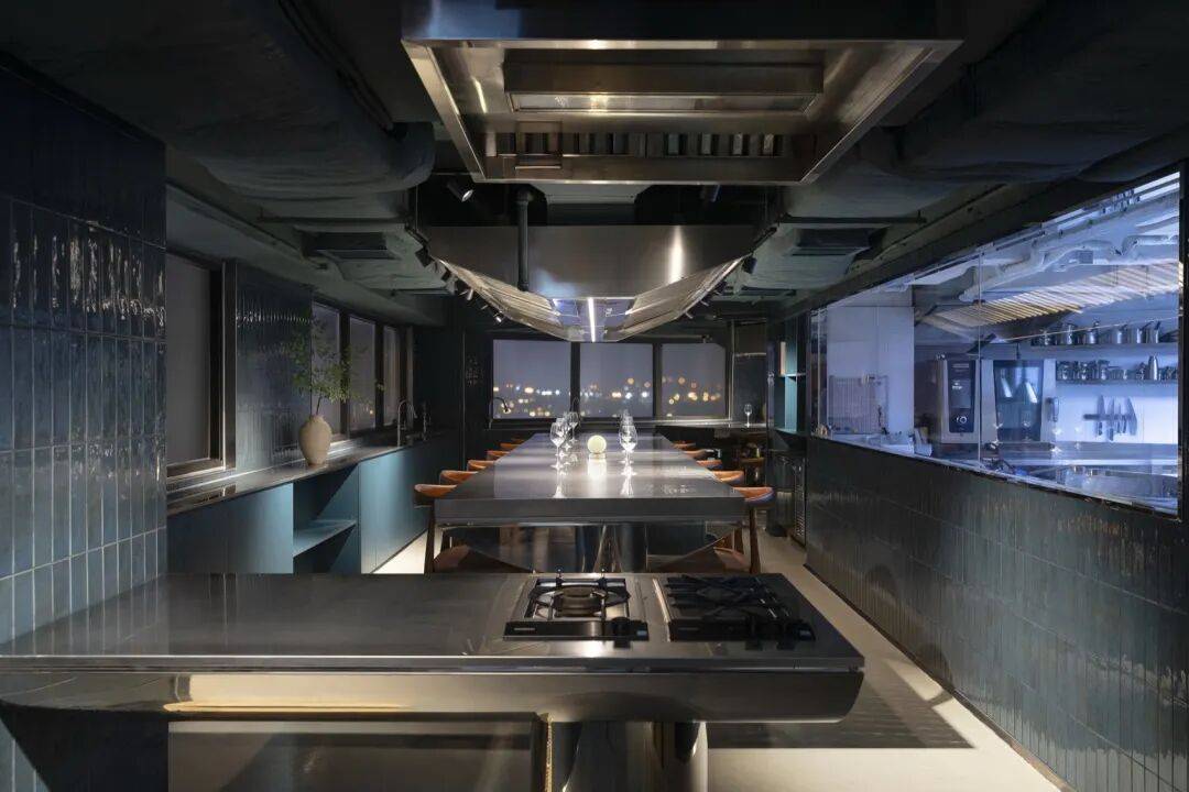 ▲SOL标志 © Nicholas Wong Sixteen Photography 拥抱自然的节律 Solstice Culinary Space 以一种柔和且连续的节奏展开,呼应地球的自然更替。作为“冬至”象征的烹饪工作室采用深沉且稳定的炭灰与靛蓝色调,唤起漫长冬夜的静谧氛围。陶瓷砖与不锈钢等富有触感的材料强化了空间的触觉体验与内省特质。