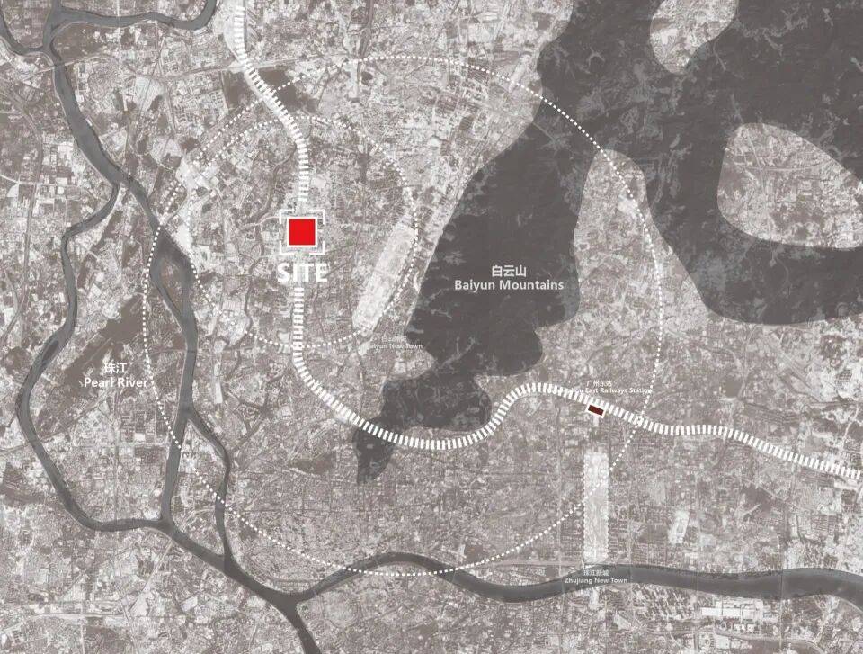 01. 微缩城市:立体叠合的山水城市盆景 项目基于原规划方案“站城一体”理念的基础上,重新整合上部建筑,将上部建筑群重新统一规划设计,提出“城市盆景”概念。白云站位于中间,四座超高层塔楼分置车站四隅,南北中间各七座副塔错落其间,围合出山水格局的微缩城市。这座微缩城市涵盖办公、公寓、酒店等业态,建筑群落在四层共享平台上,实现功能闭环。盖上建筑群形体吸取高铁轨道以及附近的山水环境特征,让综合体成为自然、人文与基础设施交融的立体城市山水画卷。 ▼区位分析 © 华南理工大学建筑设计研究院有限公司