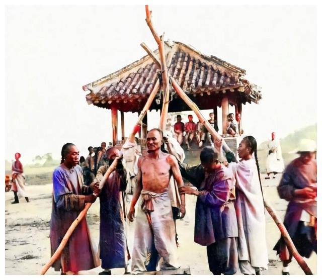 被凌迟的那位男子,是照片中最俊朗、最刚毅的人。清朝人普遍弯腰驼背,骨瘦如柴,面色菜色,看着他的坚毅,更显清朝衰败的必然。