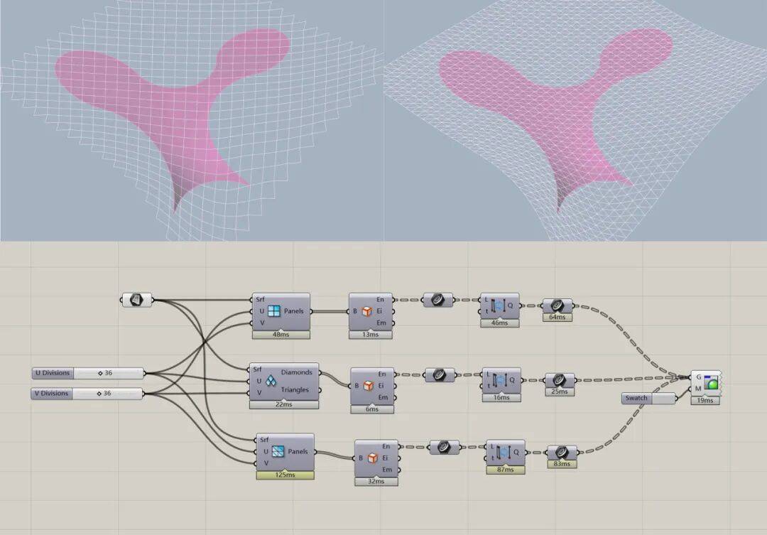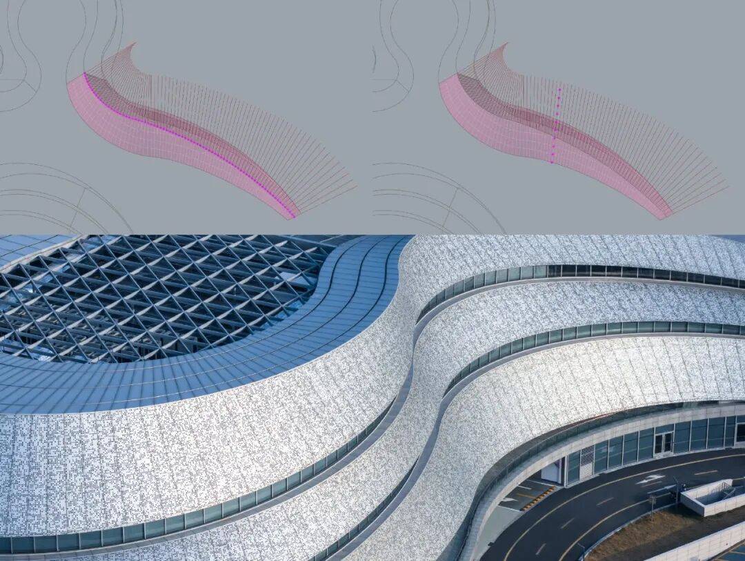 金属板划分分析图©ZIAD 在金属板的划分上,BIM技术的优势得到了充分体现。它能够处理大量数据,这在过去需要大量的人工劳动。通过改变曲面上点的数据排列结构,我们能够精确控制金属面板的分割。不同的排列方式可以生成不同的结果,而且通过微调输入参数,我们能够精确调整划分尺寸,甚至实时显示划分数量。这是BIM技术在后期施工控制中提供辅助的一个典型例子。