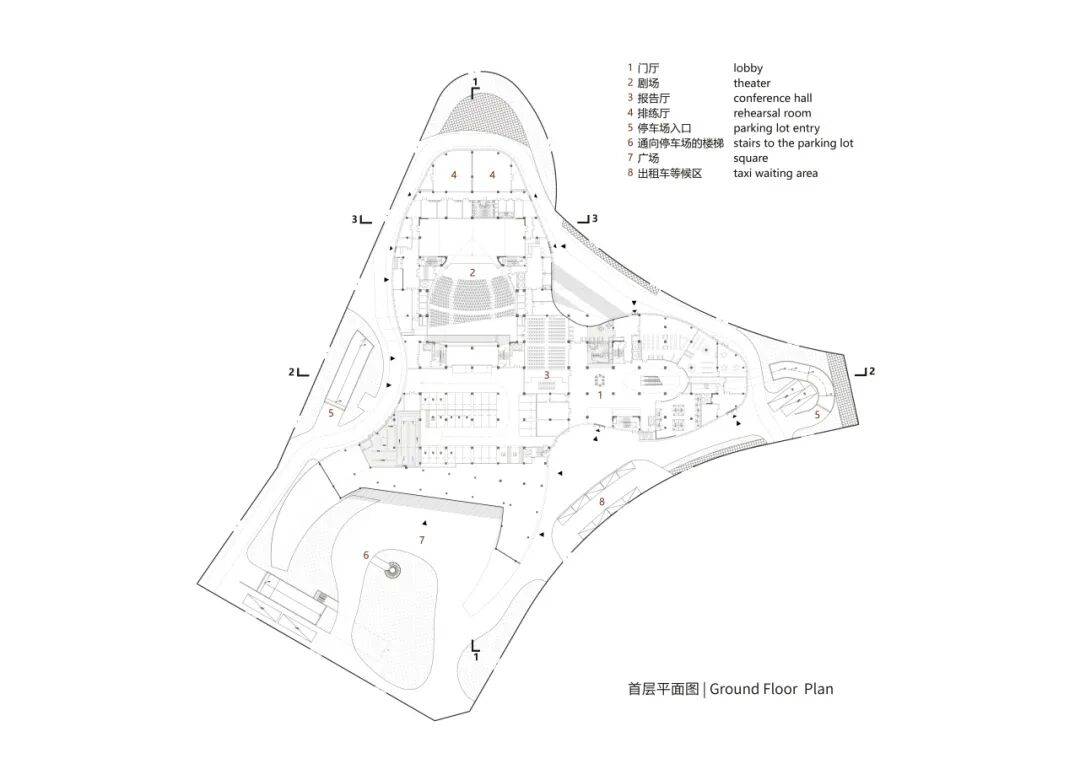 项目区位图©ZIAD 项目用地性质为文化设施用地,总建筑面积为35733平方米,主要使用功能为文化馆、图书馆,具体包含文艺演出、文化展览、图书阅览、娱乐休闲等。馆内设有一座1200座的剧场,兼顾会议功能,同时满足文艺演出的要求。