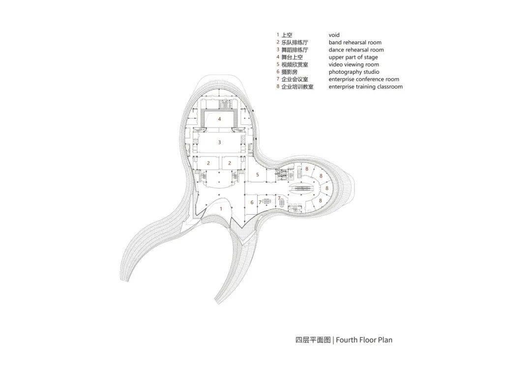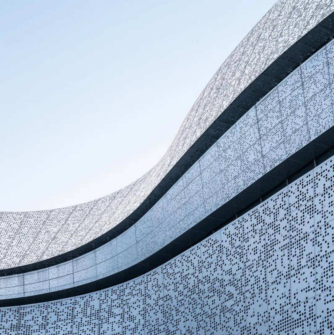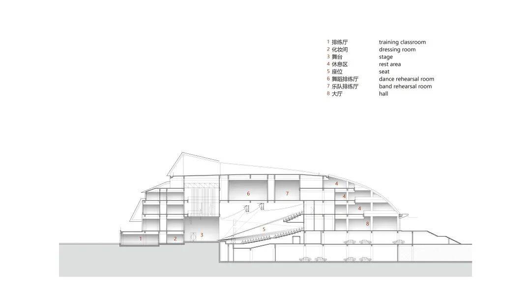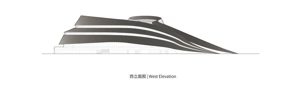 沿湖俯瞰图©文沛 剧院的建筑设计打破了传统意义上不可接近的实体形象,转而成为了一个充满活力和互动的公共空间。建筑底部设计了一个相对较大的基座,而在二层则环绕着一圈露台,与场地和二层大厅形成互动。这种收分处理和大基座的设计,不仅使整个建筑显得更加轻盈富有层次感,而且在这里,你可以攀爬、漫步、远眺,获得多重的空间体验。大剧院不仅仅是一个观看演出的场所,它更像是一件与观众互动的艺术“装置”。 形态生成分析图©ZIAD 滨海文化艺术中心的设计灵感源自水袖般轻盈舞动的特性。这种设计理念不仅体现在建筑的整体布局上,也延续到了外立面的设计中。外立面通过层层水平线条的起伏、交织和分离,形成了一种独特的外立面肌理,仿佛水袖在空中舞动的轨迹。在外立面的材质选择上,侧面部分主要采用了浅色穿孔铝板,而建筑顶部则用实体铝板覆盖,这样的对比不仅区分了外立面,还进一步强调了水袖舞动的动感。整体设计巧妙地融合了传统与现代元素,创造出一种既优雅又充满活力的建筑风格。