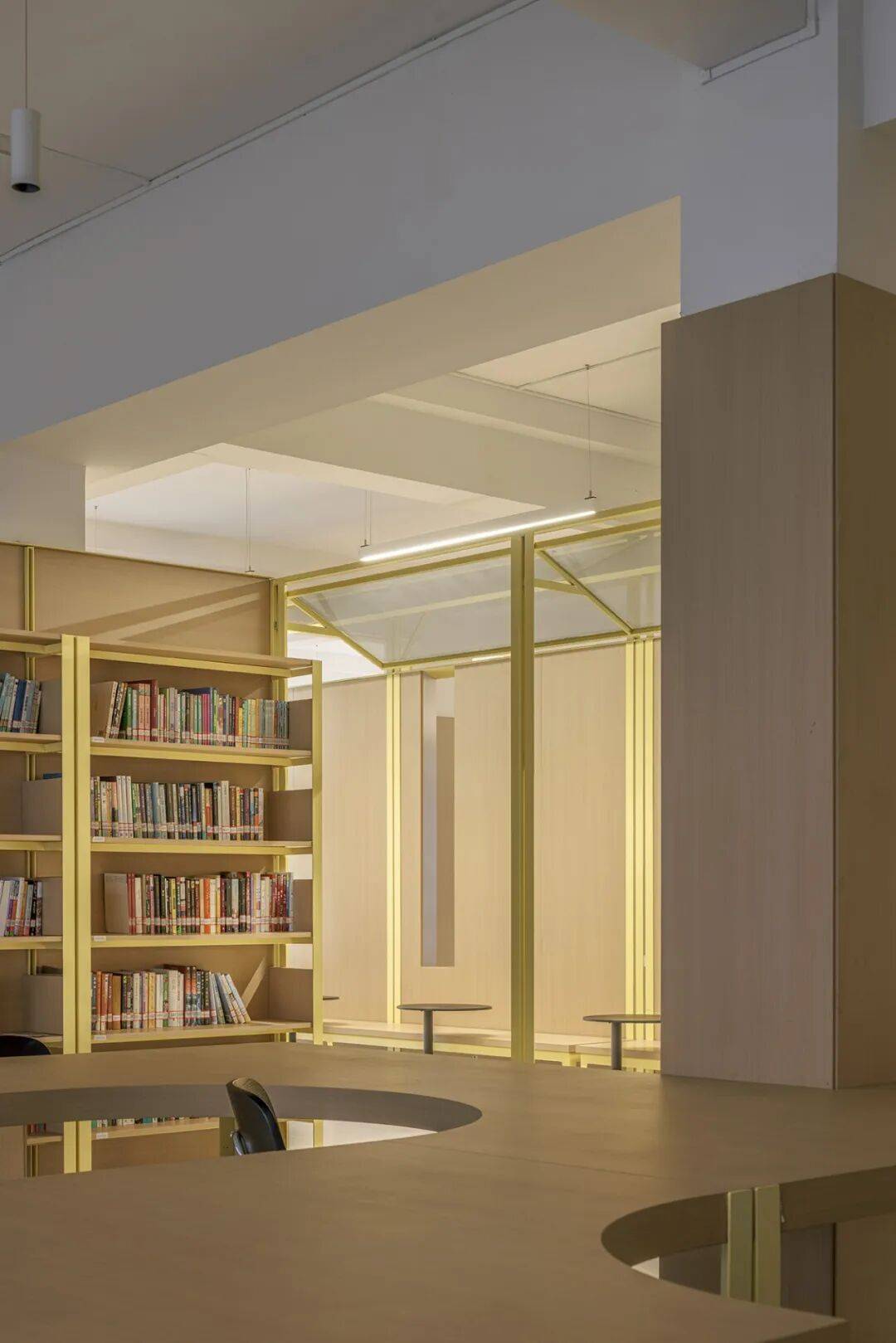 © 刘国威 在入口处的灵活读书区,旋转书架会成为了改变空间状态的动态“机关”。当书架完全打开时,图书室就像一个向四周延展的广场,偏转的组件打破了老建筑原本刻板的正交秩序,带来灵活地漫游体验;而当需要分区使用时,书架又能闭合并切分空间,有效保障两侧功能区的独立性。