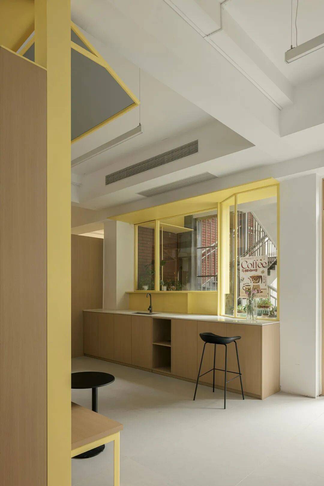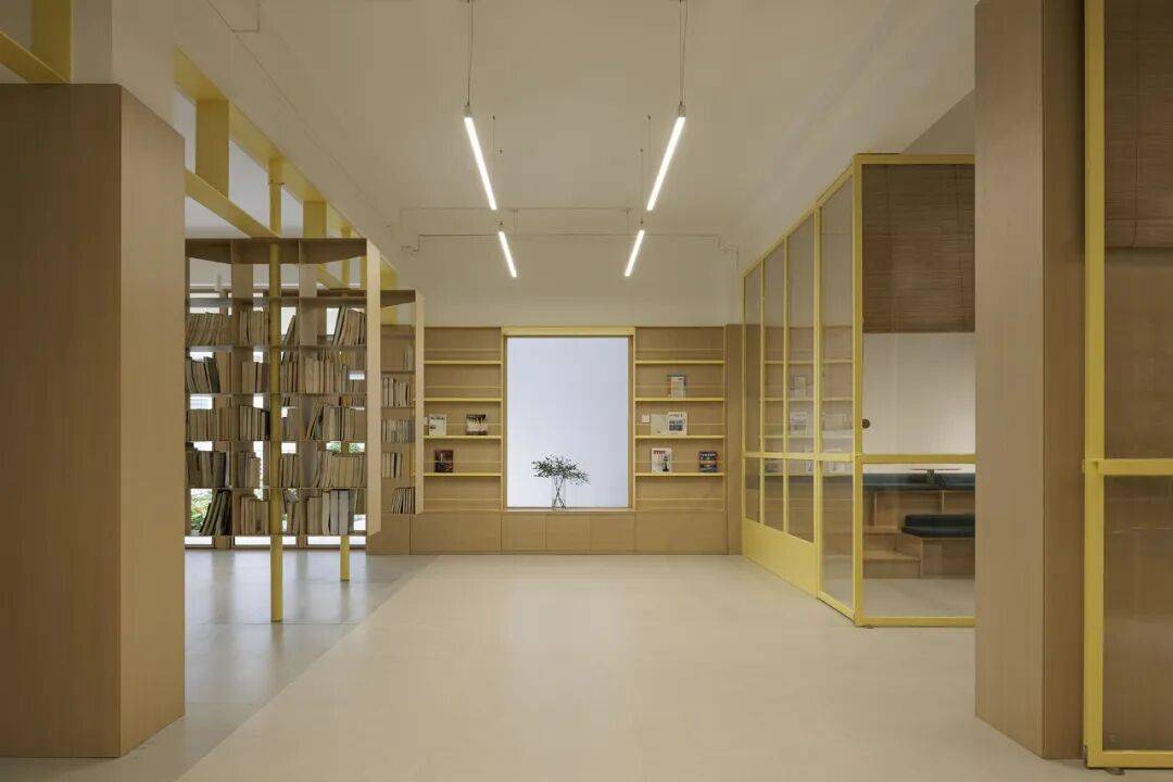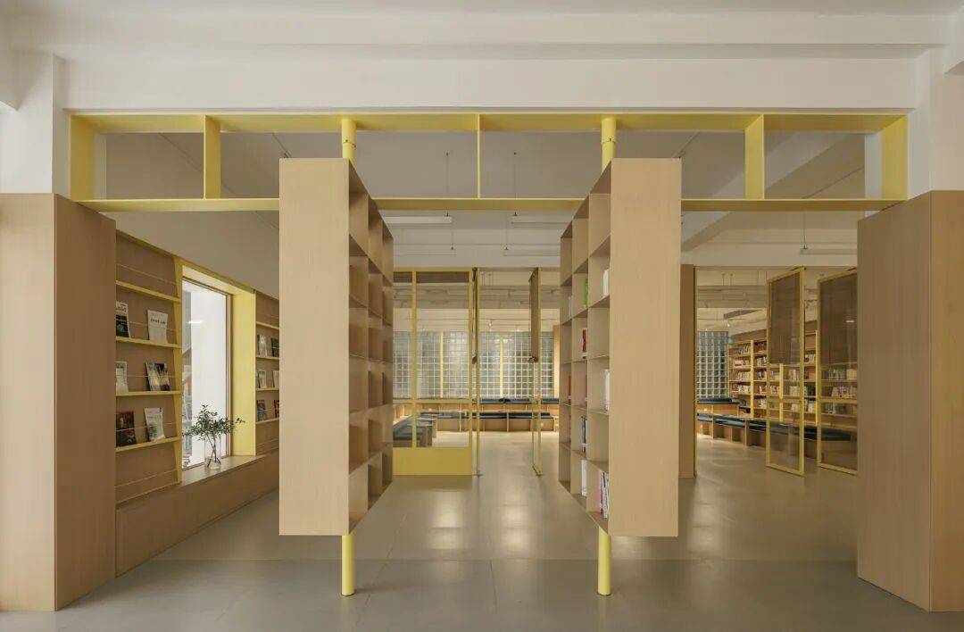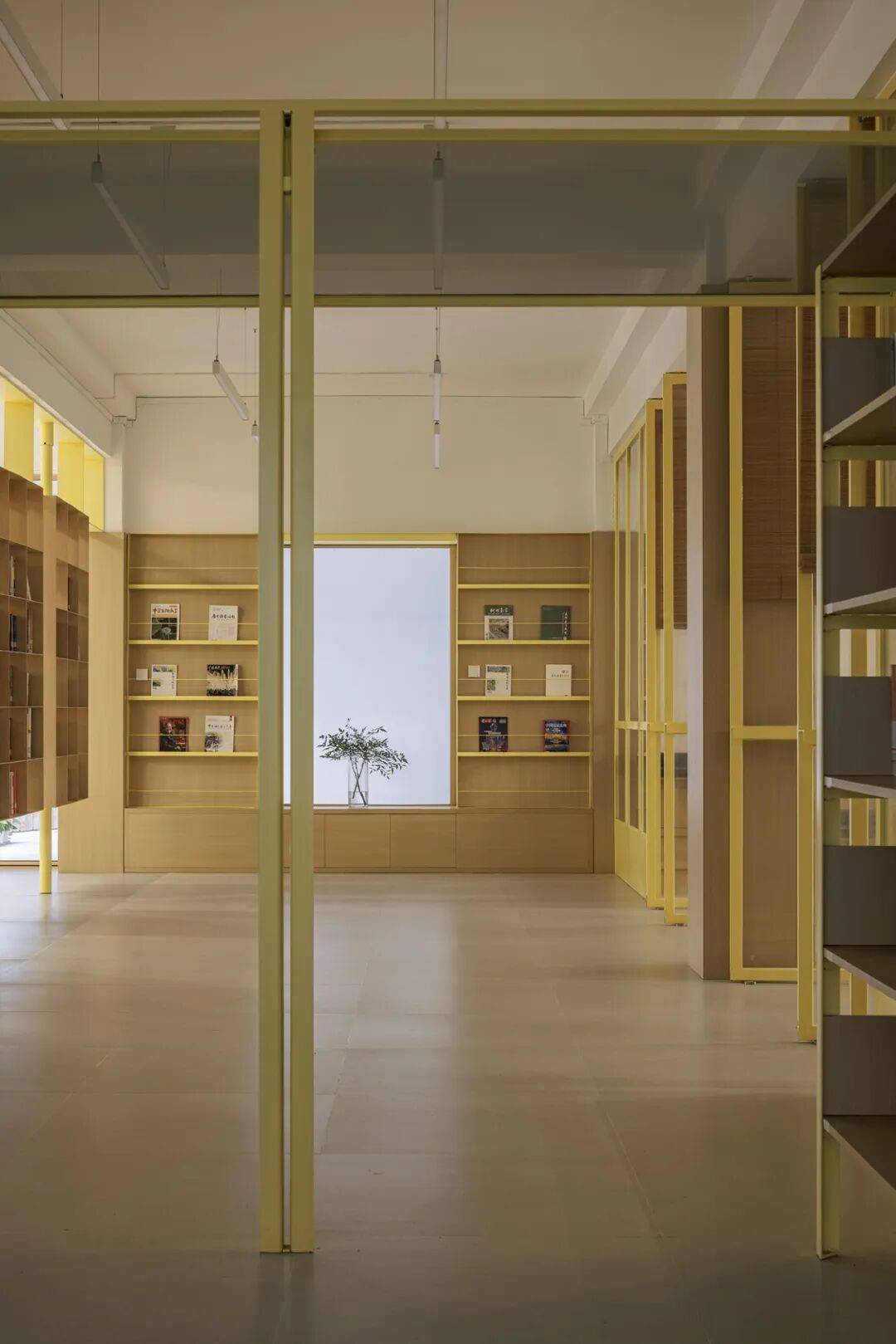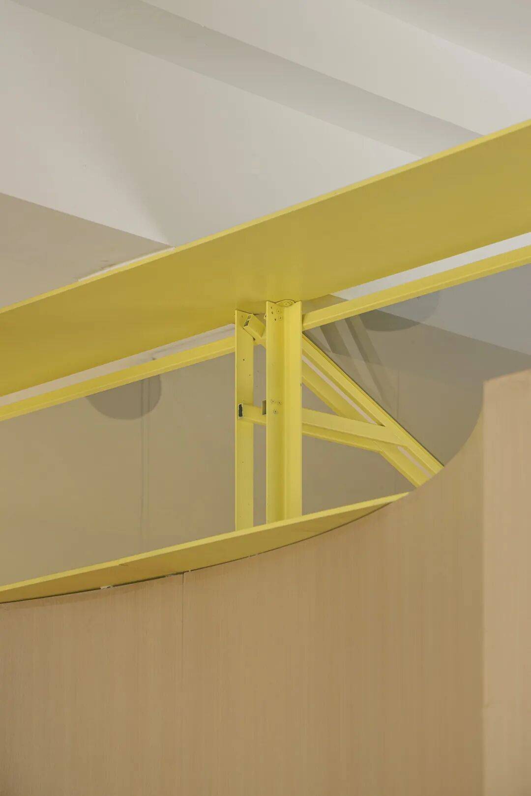 © 刘国威 真实性,也体现在对剖面尺度的控制上。空调设备布置的区域,我们顺势压低吊顶,在局部营造出强烈的包裹感。而大部分空间则裸露梁柱,以达成开阔效果。室内大面积采用木作书架不做装饰。包裹柱子的木饰面控制在一个高度线,不与楼板和梁柱相接,以醒目的黄色钢架作为过渡。“不贴顶”的处理在垂直方向上拉开了清晰的视觉层次,凸显轻质“插件系统”与老建筑主体之间相互独立的真实关系。
