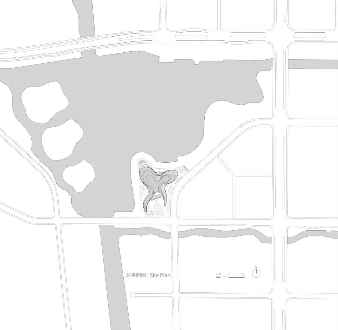 夜景鸟瞰图©文沛 02. 设计理念 绍兴,这座江南水乡,以其密布的水网和蜿蜒的河流而闻名。在这片充满诗意的土地上,滨海文化艺术中心应运而生。它依湖而建,灵感来源于周围河畔的自然风光,沿着曲折的河岸线伸展,仿佛一条飘动的丝绸,从自然之中优雅地升起,成为绍兴水岸地平线的一部分。与周围产业园区的规整城市布局形成鲜明对比,艺术中心以其独特的自然之美脱颖而出,成为一处融合人文、艺术与自然的大地景观。