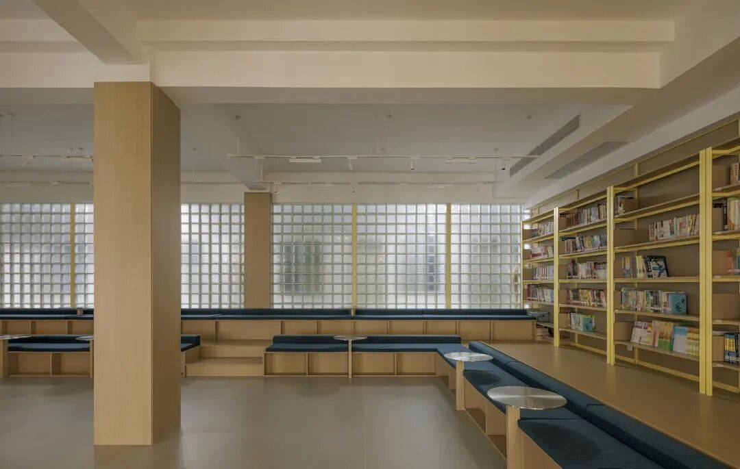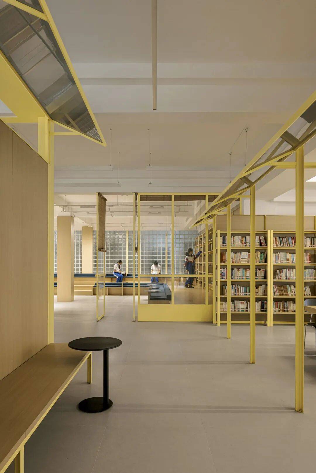 © 刘国威 依靠这套系统,达成一个去中心化、自由穿行的流线。空间中没有使用隔墙做物理分割,而是通过地面材料的颜色变化标示区域划分。学生可以像在公园里散步一样在其中穿梭、取阅书籍,原本消极的走廊空间也由此转化为了富有流动性的公共活动场。